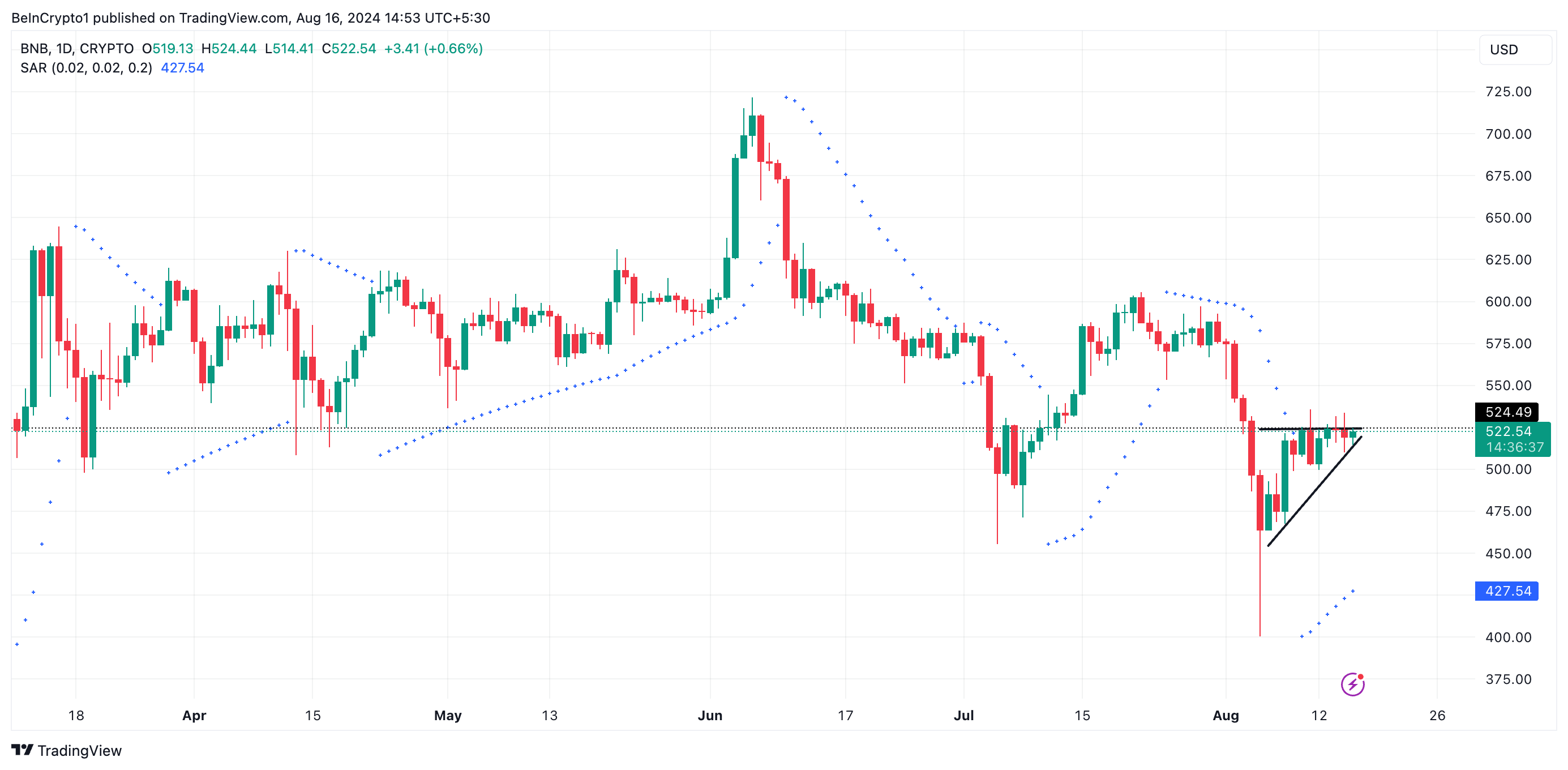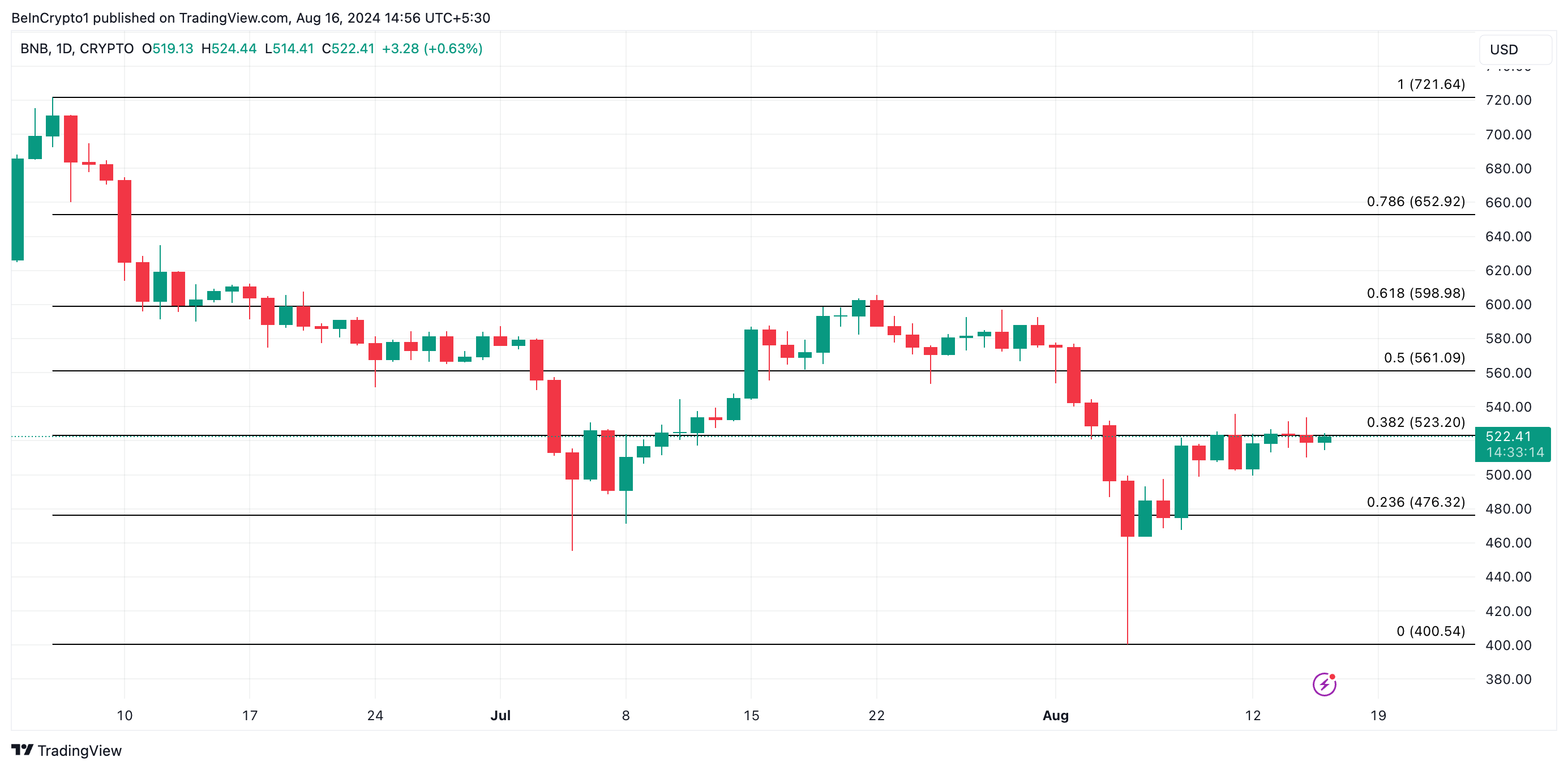 ปัจจุบันมีราคาอยู่ที่ 522.63 ดอลลาร์ BNB มีราคาเพิ่มขึ้น 16% นับตั้งแต่การลดลงนั้น