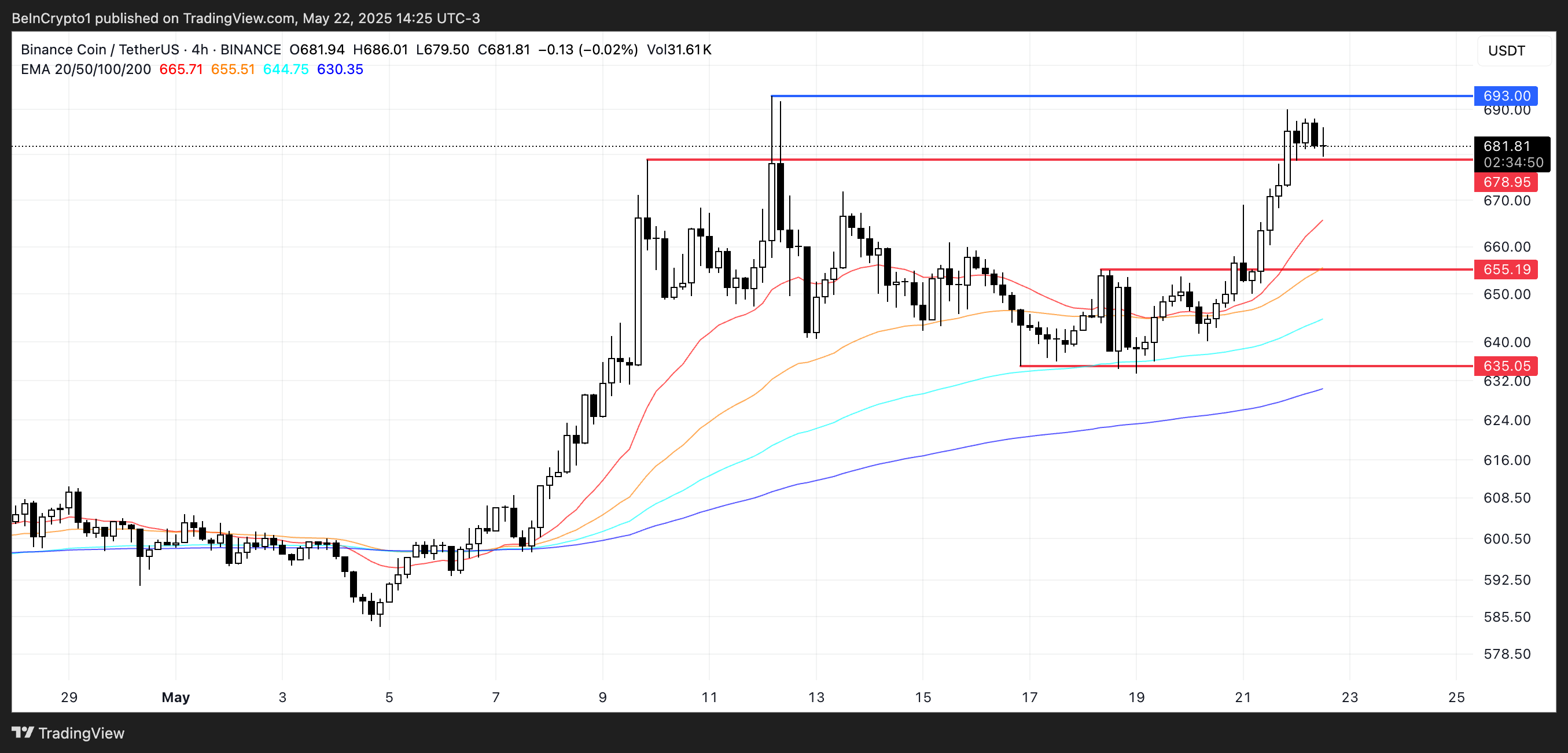 หากแนวโน้มขาขึ้นในปัจจุบันยังคงอยู่ BNB อาจดันขึ้นไปท้าทายระดับแนวต้านถัดไป อย่างไรก็ตาม ควรระมัดระวัง: แรงกดดันขาลงอาจเพิ่มขึ้นหากการสนับสนุนที่ USD 678 แตก ซึ่งอาจทำให้ราคาลดลงไปที่ USD 655 หรือแม้แต่ USD 635 ในการปรับฐานที่ยาวนานขึ้น