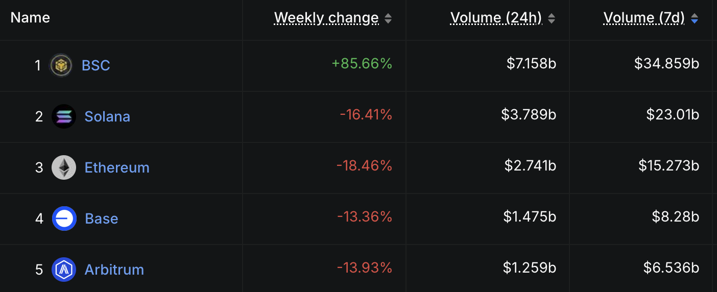 ยอดรวมรายสัปดาห์นั้นสูงกว่าปริมาณรวมของ DEX สี่อันดับแรกของ Solana—Orca, Meteora, Raydium และ Pump ซึ่งเน้นย้ำถึงการครอบงำที่เพิ่มขึ้นของ BNB ใน DeFi