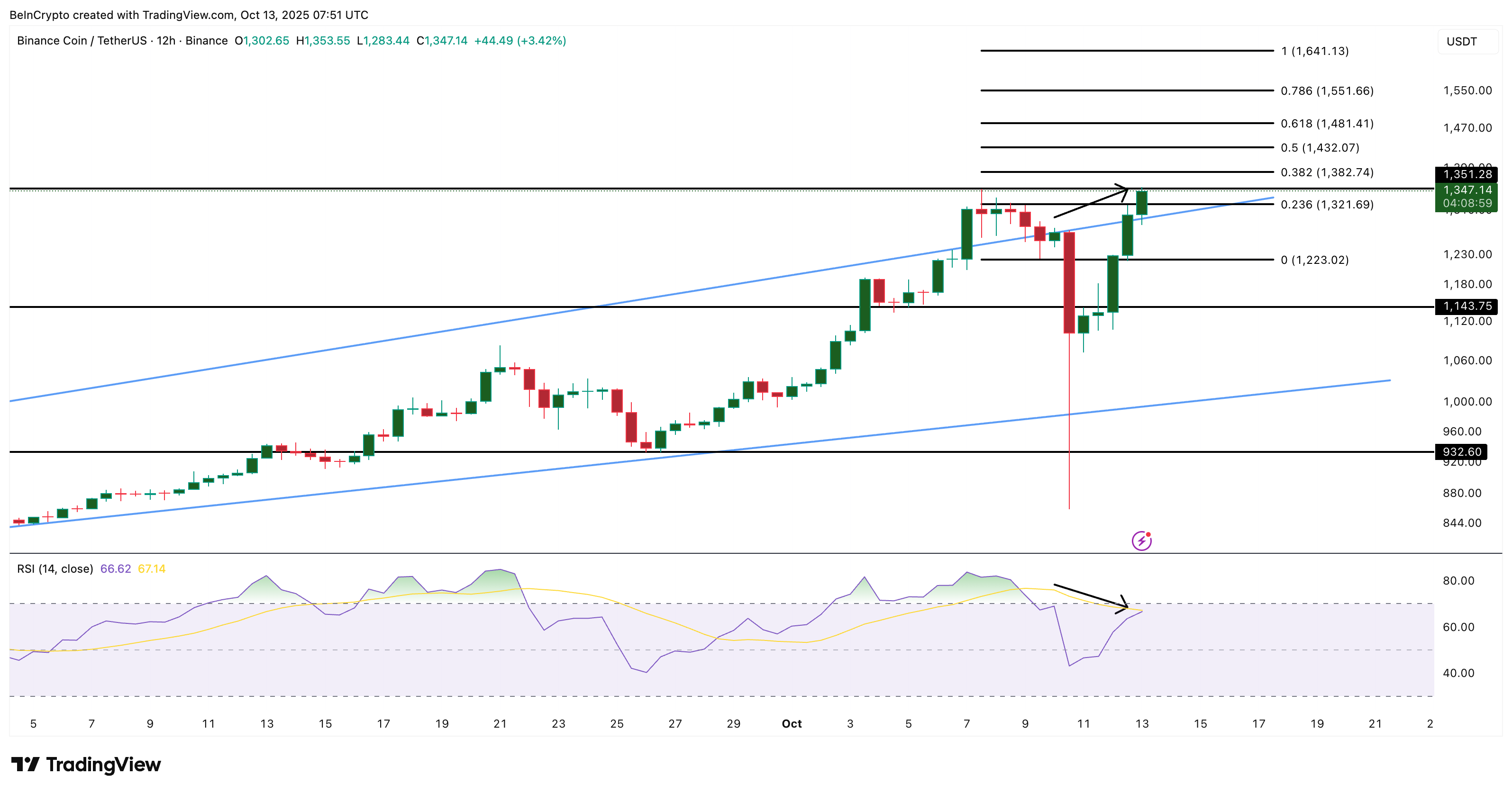 ตอนนี้ BNB ซื้อขายอยู่ที่ประมาณ 1,340 USD ทดสอบระดับการขยาย Fibonacci 0.382 ที่ 1,382 USD ซึ่งวัดจากการแกว่งก่อนหน้าระหว่าง 930 USD (ต่ำ) และ 1,350 USD (สูง) โดยมีการปรับฐานไปที่ 1,220 USD