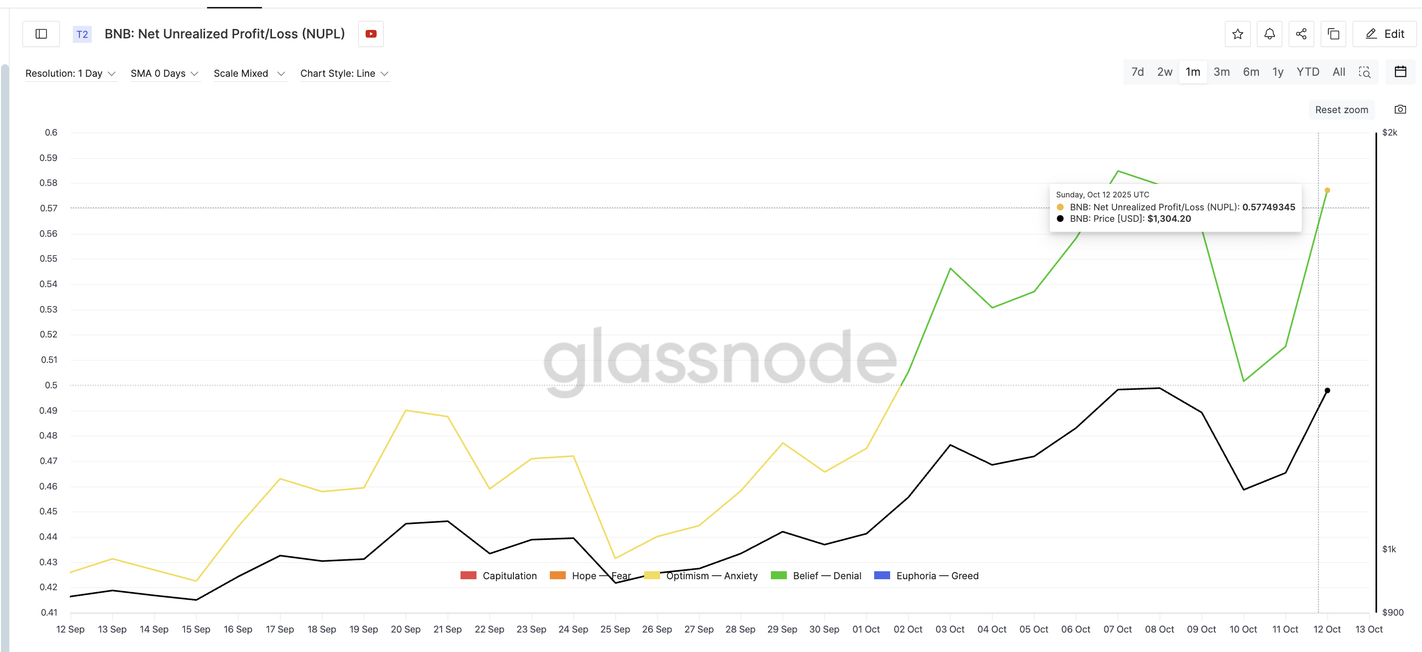 NUPL ของ BNB ได้เพิ่มขึ้นถึง 0.57 ซึ่งเป็นระดับที่เคยถึงเมื่อวันที่ 7 ตุลาคม ก่อนที่ ราคาของ BNB จะปรับตัวลง 15% จากประมาณ 1,300 USD เป็น 1,100 USD