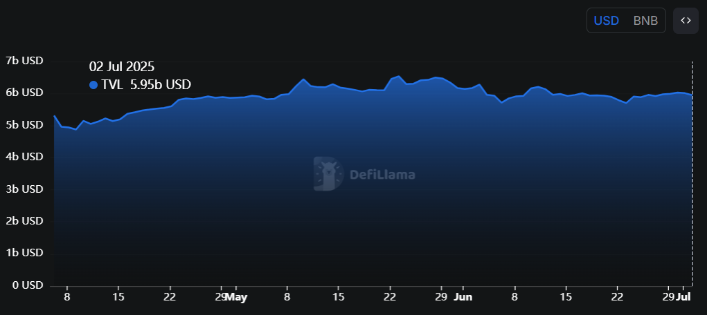 อีกปัจจัยสำคัญที่ขับเคลื่อนความเสถียรของราคา BNB คือบทบาทของมันในตลาดสกุลเงินดิจิทัลที่กว้างขึ้น BNB Smart Chain (BSC) มีมูลค่ารวมที่ถูกล็อค (TVL) อยู่ที่ 5.95 พันล้าน USD ซึ่งมีส่วนสำคัญต่อการเติบโตและความเสถียรของ BNB อย่างต่อเนื่อง