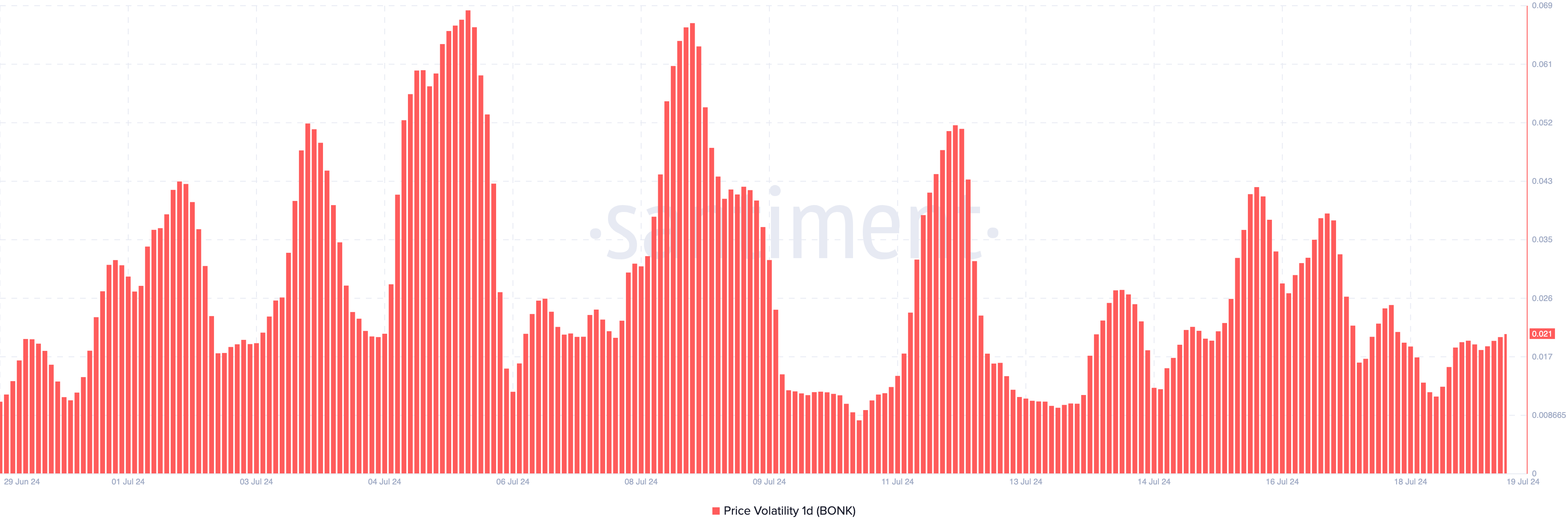 ในทางกลับกัน ความผันผวนต่ํา ส่วนใหญ่ทําให้เกิดการเคลื่อนไหวด้านข้าง สําหรับ BONK ข้อมูลจาก Santiment แสดงให้เห็นว่าความผันผวนเพิ่มขึ้น ซึ่งบ่งชี้ว่าเหรียญมีมอาจประสบกับการแกว่งตัวของราคาที่โดดเด่นในระยะสั้น