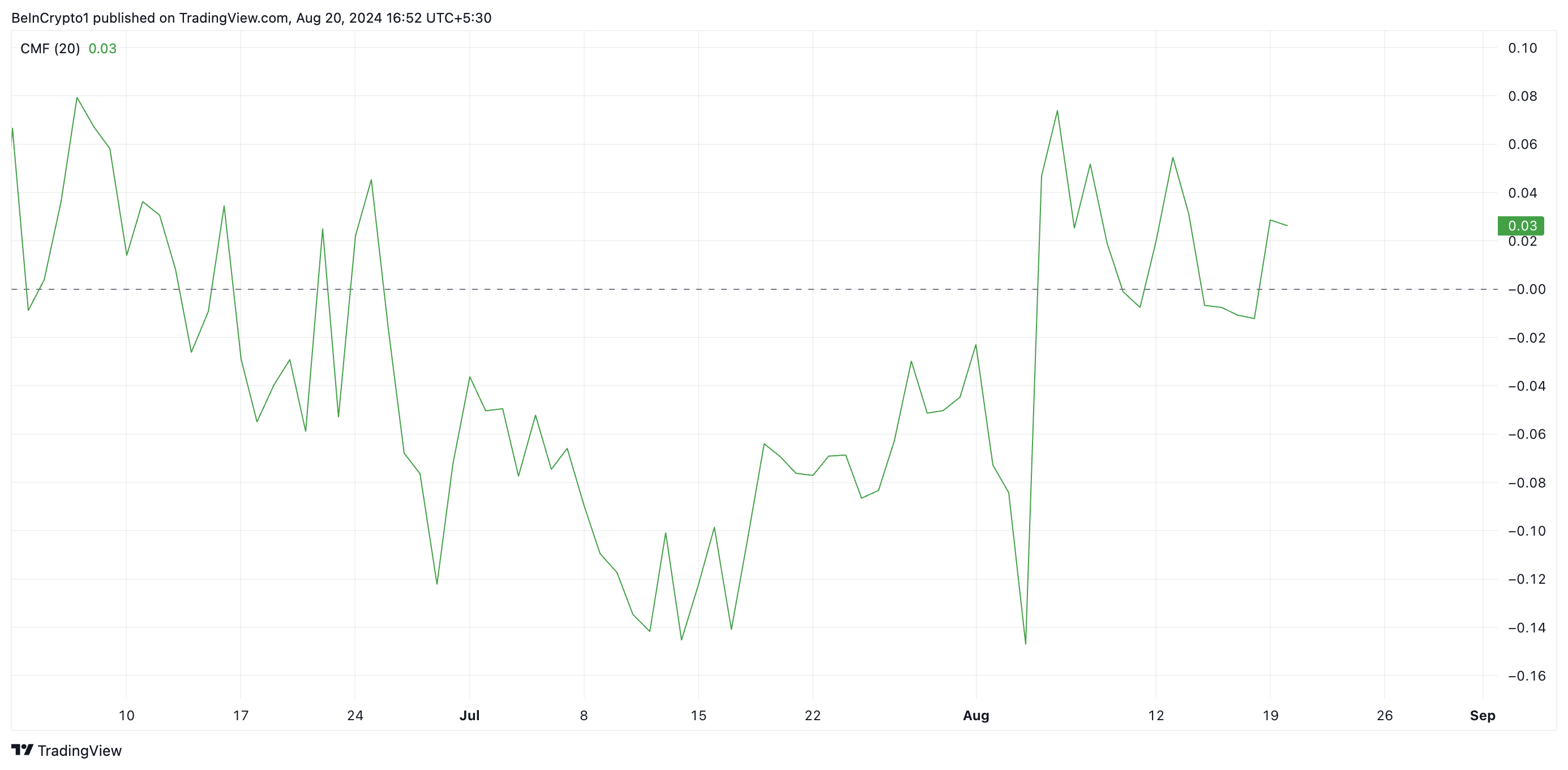 นอกจากนี้ Chaikin Money Flow CMF ของ Token ยังอยู่เหนือเส้นกึ่งกลางที่ 0.04 CMF ติดตามการไหลของเงินเข้าและออกจากสินทรัพย์ และมูลค่าที่สูงกว่าศูนย์บ่งบอกถึงความแข็งแกร่งของตลาด ซึ่งบ่งชี้ถึงการไหลเข้าของสภาพคล่อง