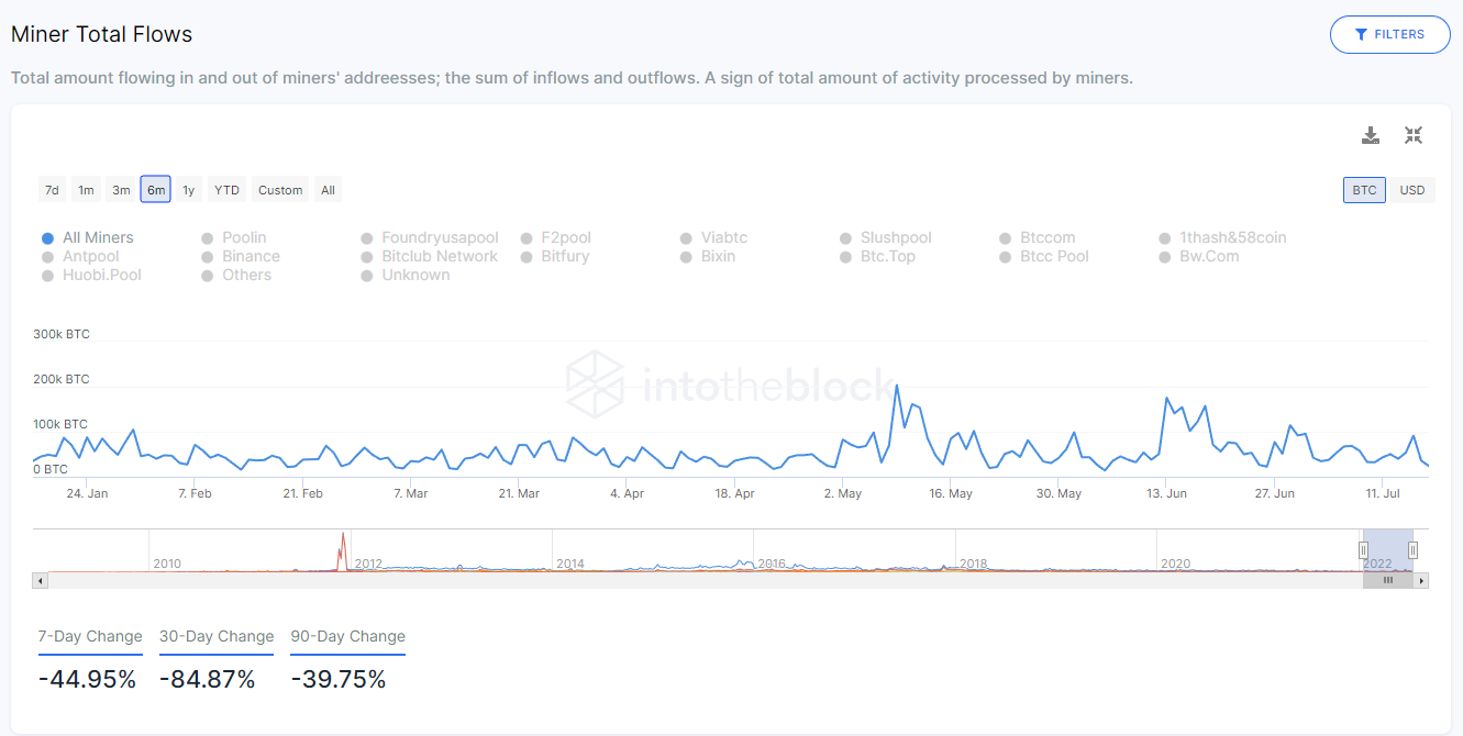 อ้างอิงข้อมูลจาก IntotheBlock พฤติกรรมของนักขุดรายใหญ่ เช่น Antpool Binance F2Pool Slushpool และอื่นๆ รวมแล้วนับว่ายังคงเป็นลบอยู่ทั้งในระดับสัปดาห์ เดือน และ ไตรมาส ติด – 44.95% -84.84% และ -39.75% ตามลำดับจากข้อมูล Miner Total Flows (ข้อมูลจำนวนเหรียญที่เข้าออกในกระเป๋าของนักขุด) การที่จำนวนเหรียญไหลออกนั้นหมายความว่านักขุดยังคงลดความเสี่ยงโดยการทยอยขายบิทคอยด์ออกมากกว่าการเก็บสะสมนั่นเอง