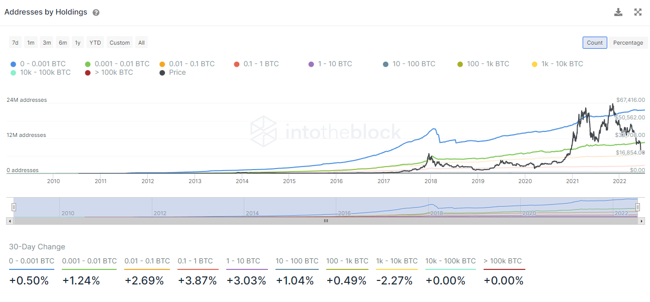อ้างอิงข้อมูลจาก IntotheBlock กลุ่มผู้ซื้อที่ผลักดันตลาดขึ้นในช่วงนี้คือกลุ่มรายย่อยที่มีจำนวนมากขึ้นในช่วง 30 วันที่ผ่านมา โดยมีมูลค่าการถือครองในกระเป๋าที่ประมาณ 0.001 – 100 เหรียญ และกลุ่มที่เพิ่มขึ้นมาที่สุดคือกลุ่ม 0.1- 1 เหรียญ ที่มีจำนวนมากขึ้นกว่า 3.87% ในขณะเดียวกัน กลุ่มถือครอง 100-1000 เหรียญ อาจเป็นกลุ่มนักขุดที่กำลังลดความเสี่ยงดังที่กล่าวไปเบื้องต้น ส่วนจำนวนรายใหญ่ยังคงนิ่งไม่มีการเปลี่ยนแปลงใดๆ แต่ในขณะเดียวกันในช่วงไตรมาสที่ผ่านมามีสัญญาณการช้อนซื้อเพื่อสะสมของกลุ่มรายใหญ่ที่ถือครองจำนวนมากกว่า 0.1% ของอุปทานที่เติบโตขึ้นกว่า 1563% เมื่อวิเคราะห์ข้อมูลทั้ง 2 ชิ้นนี้อาจสรุปได้ว่า ผู้ที่ช้อนซื้อคือ กลุ่มคนกลุ่มเดิมในตลาดอยู่แล้ว ไม่ใช่รายใหญ่เจ้าใหญ่ที่เข้ามาใหม่ในตลาด