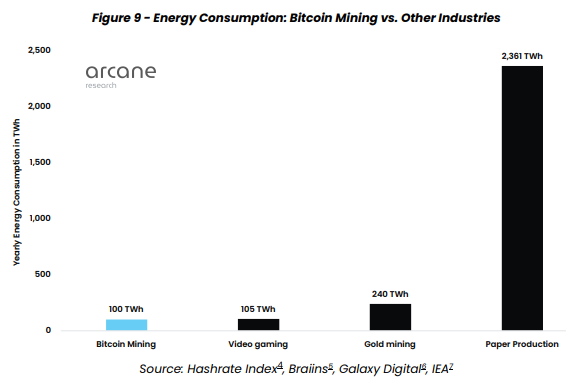 ข้อมูลจาก Arcane Research เผยการใช้พลังงานของ BTC Mining หรือ การขุด Bitcoin ใช้พลังน้อยกว่าพลังงานที่ใช้ไปกับการเล่นเกมและการขุดทองคำ