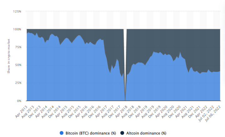 อย่างไรก็ตามแม้ว่า bitcoin จะแสดงความแข็งแกร่งอย่างมีนัยสำคัญในตลาด PoW แต่ก็ยังมีช่วงเวลาที่ยากลำบากในการรักษาอำนาจเหนืออุตสาหกรรม crypto ทั้งหมด อ้างอิงข้อมูลจาก Statista เมื่อห้าปีที่แล้ว ส่วนแบ่งบนอุตสาหกรรม crypto ของ bitcoin นั้นสูงกว่า 95% แต่มันกำลังถูก altcoins ต่างๆ แย่งส่วนแบ่งบนตลาดนี้ไป จนในปัจจุบันเหลือเพียง 41.68%