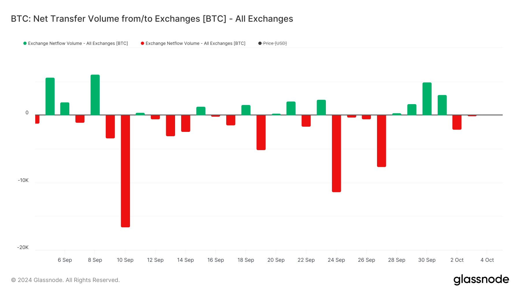 ในวันที่ 10 กันยายน เราเห็นการไหลออกมากที่สุด ถึง -16,000 BTC ซึ่งโดยทั่วไปเป็นสัญญาณที่ดีมาก เนื่องจากบ่งชี้ว่าผู้ถือกำลังย้าย Bitcoin จำนวนมากออกจากตลาดแลกเปลี่ยน ลดปริมาณที่มีจำหน่ายสำหรับการขาย อย่างไรก็ตาม หลังจากการไหลออกครั้งใหญ่นั้น รูปแบบการเคลื่อนไหวก็ไม่ชัดเจนเท่าที่ควร