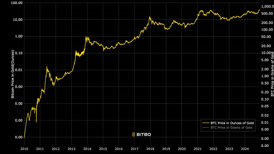เมื่ออัตราส่วนนี้เพิ่มขึ้น Bitcoin กำลังมีมูลค่าเพิ่มขึ้นเมื่อเทียบกับทองคำ ซึ่งบ่งบอกถึงความเชื่อมั่นที่เพิ่มขึ้นของนักลงทุนใน Bitcoin ในฐานะสินทรัพย์
