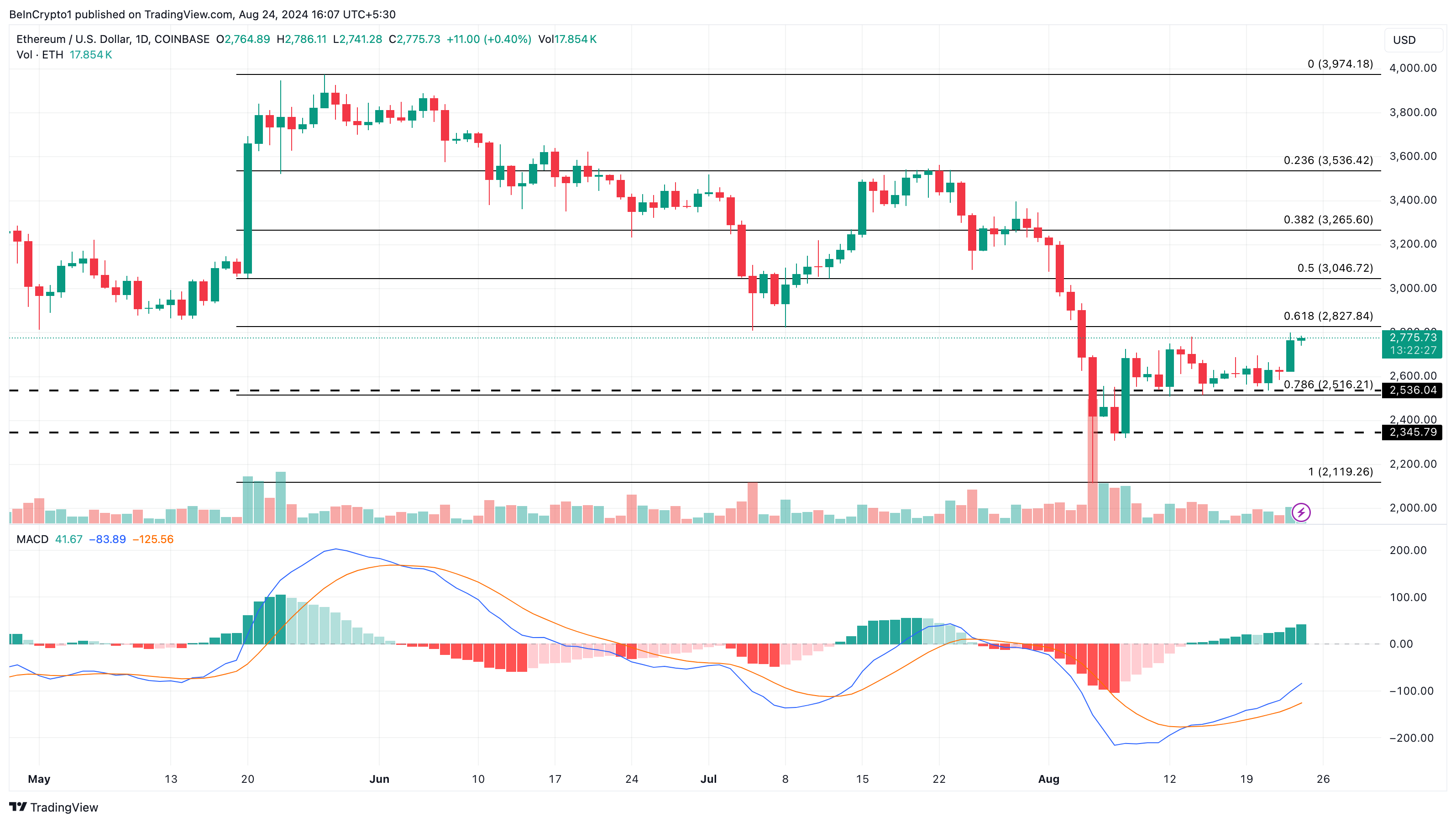 โมเมนตัมการซื้อล่าสุด ซึ่งเน้นโดยตัวบ่งชี้ Moving Average Convergence Divergence (MACD) ชี้ให้เห็นว่าราคาของ ETH อาจสูงถึง $2,829.50 ในระยะสั้น MACD วัดโมเมนตัม โดยการอ่านค่าเชิงบวกบ่งชี้ถึงความเชื่อมั่นในตลาดกระทิง และการอ่านค่าเชิงลบส่งสัญญาณถึงแนวโน้มขาลง