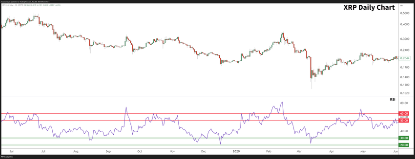 ตัวอย่างเช่น กราฟรายวันของ XRP ตั้งแต่เดือนพฤษภาคม 2019 ถึงมิถุนายน 2020