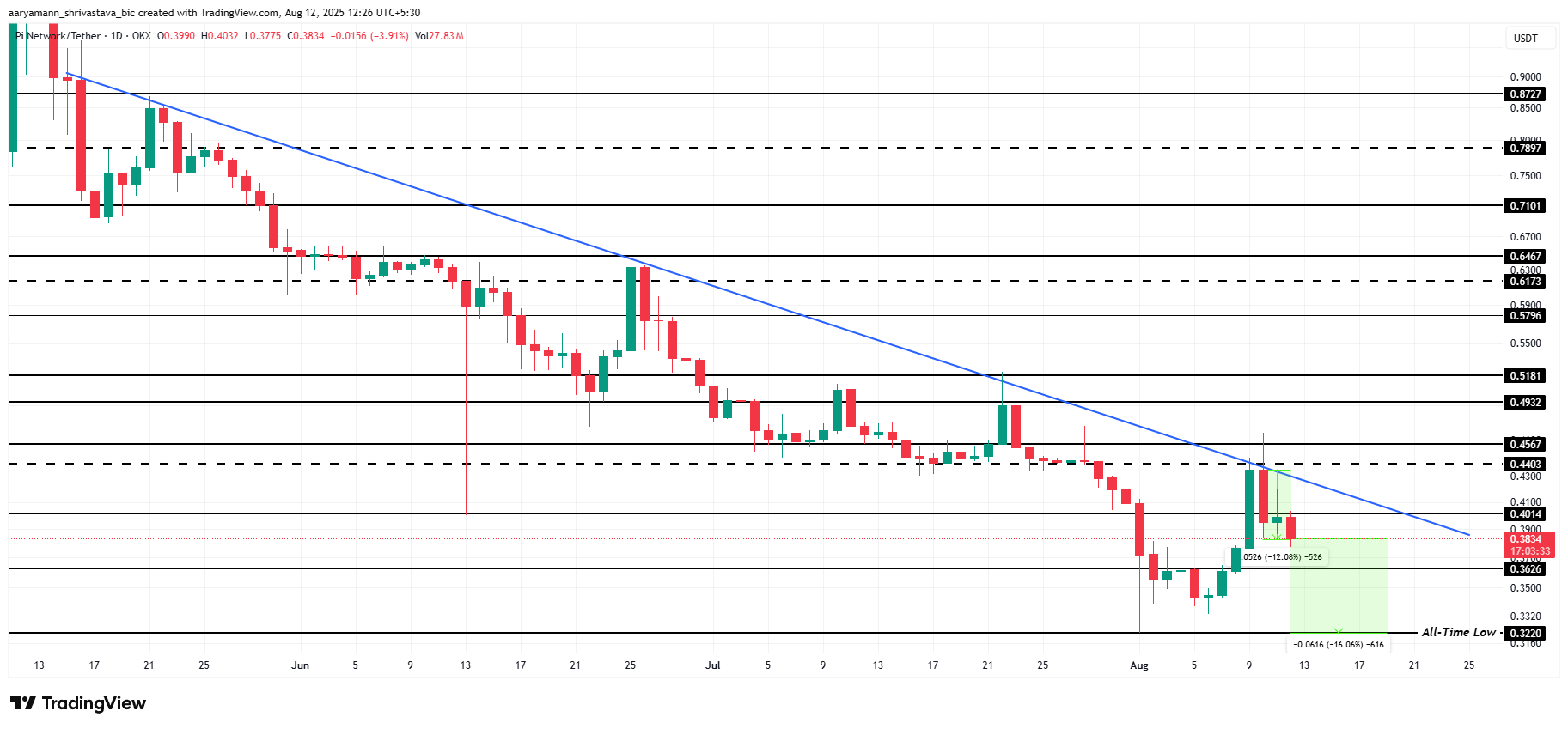 ปัจจุบัน Pi Coin ซื้อขายที่ USD0.383 โดยไม่สามารถทะลุแนวต้านสำคัญที่ USD0.440 ได้ ส่งผลให้ราคาลดลง 12% ในช่วงสามวันที่ผ่านมา ยืนยันแนวโน้มขาลงที่ดำเนินมาเป็นเวลาสามเดือน การไม่สามารถทะลุแนวต้านสำคัญได้ทำให้ Pi Coin เสี่ยงต่อการขาดทุนเพิ่มเติม