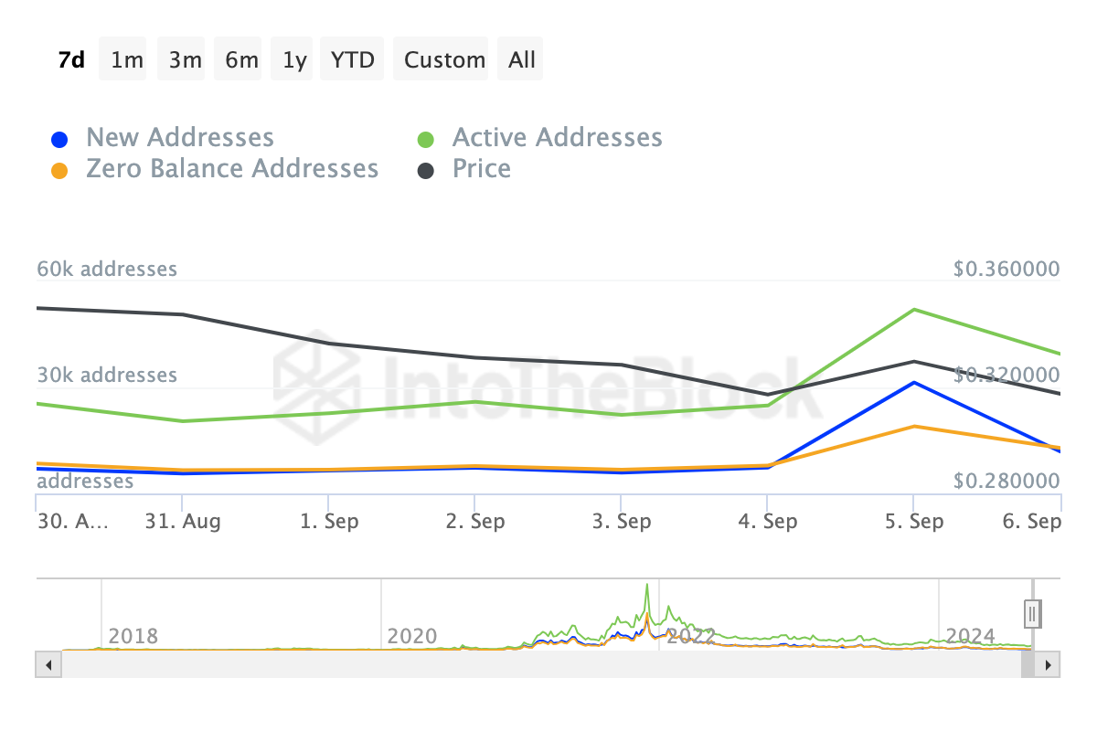 ราคาของ Cardano ในปัจจุบันอยู่ที่ 0.32 USD ซึ่งลดลง 7% ในสัปดาห์ที่ผ่านมา อย่างไรก็ตาม ข้อมูลจาก IntoTheBlock แนะนำว่านักลงทุนบางรายมองว่านี่เป็นโอกาสในการซื้อก่อนการฟื้นตัวของตลาดที่อาจเกิดขึ้น