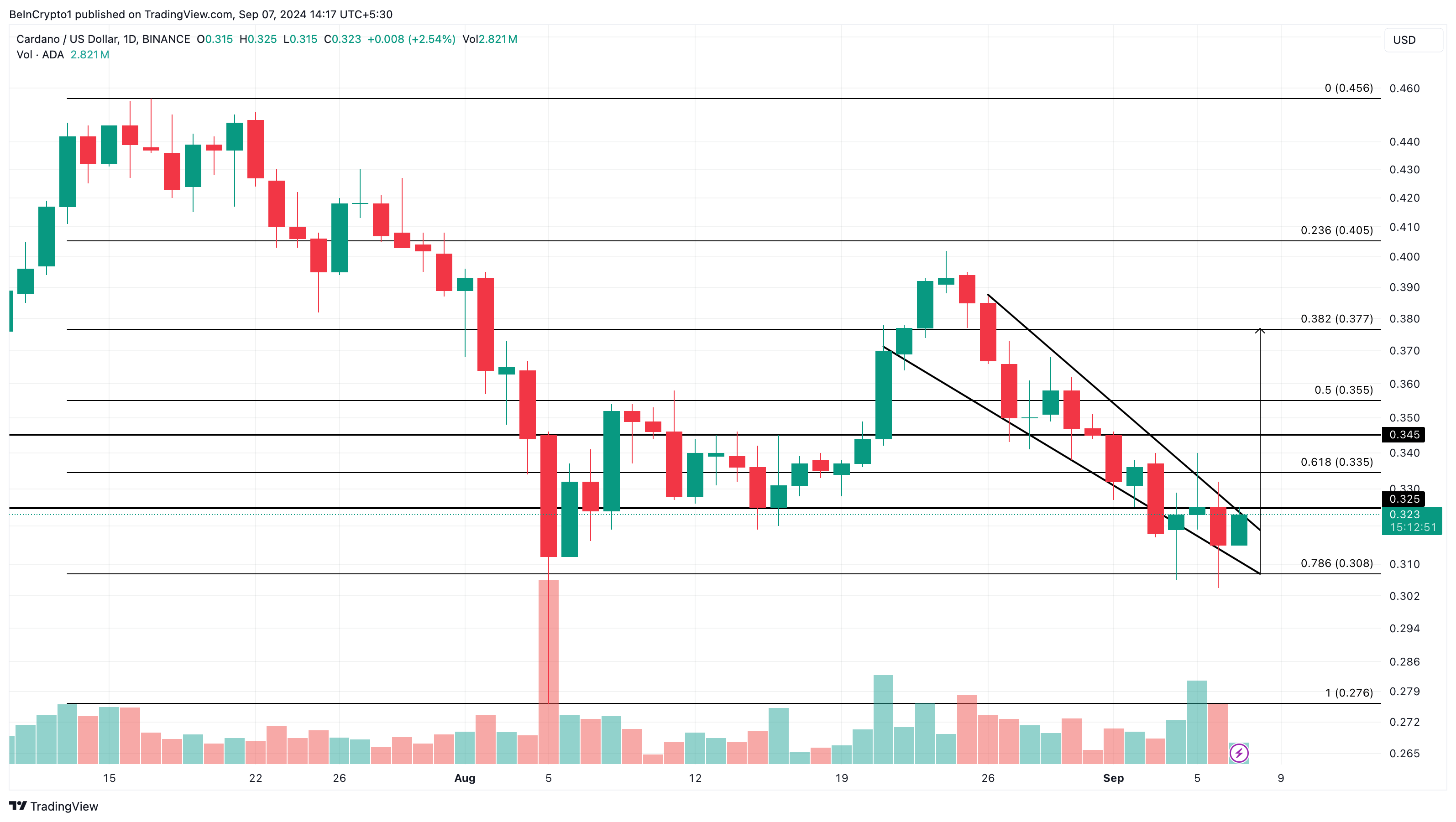 อย่างไรก็ตาม BeInCrypto ได้ระบุรูปแบบ falling wedge บนกราฟรายวันซึ่งเป็นตัวบ่งชี้ทางเทคนิคที่เป็นกระทิง ซึ่งบ่งชี้ว่า ADA อาจจะผ่านการเคลื่อนไหวลงสุดท้ายเมื่อราคาลดลงไปที่ USD0.30