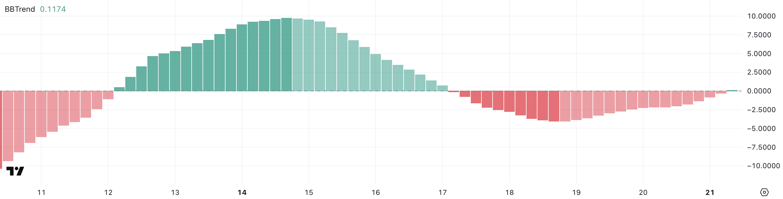 เมื่อแถบเริ่มขยายและ BBTrend เคลื่อนเข้าสู่ค่าบวก มักจะบ่งบอกถึงความผันผวนที่เพิ่มขึ้นในทิศทางของแนวโน้มขาขึ้นที่เกิดขึ้น ในทางกลับกัน การอ่านค่าลบที่ยาวนานมักจะบ่งบอกถึงแรงกระตุ้นที่ลดลงและการขาดความแข็งแกร่งในทิศทาง