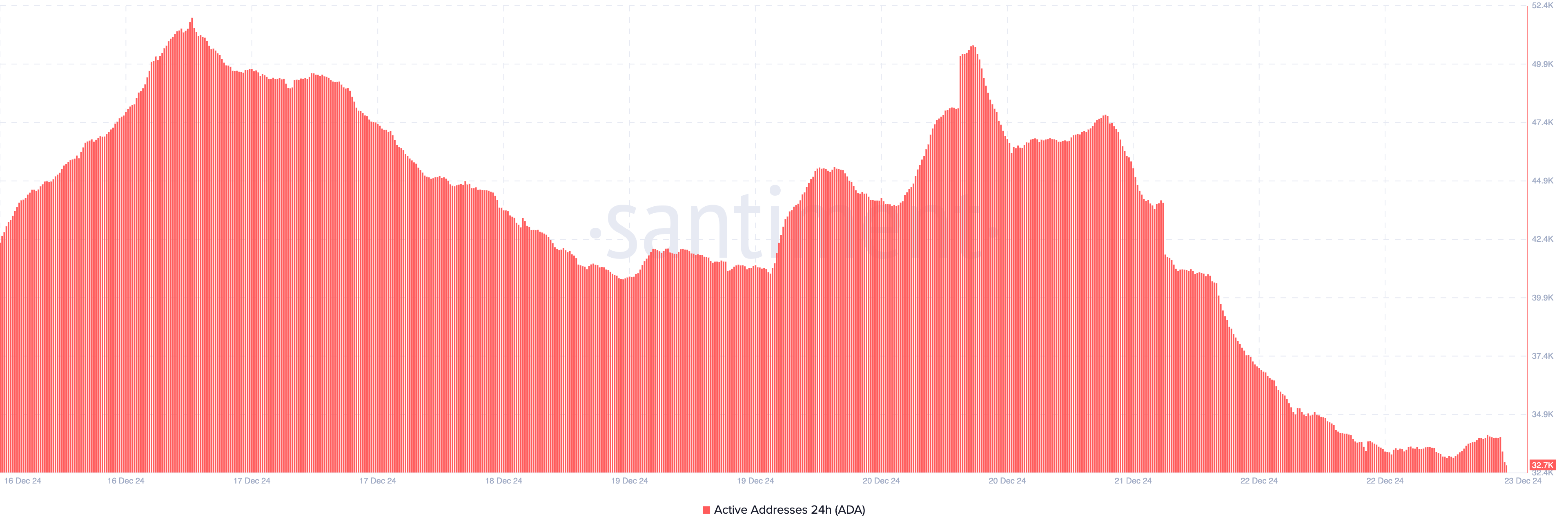ข้อมูลจาก Santiment สนับสนุนความรู้สึกนี้ โดยเน้นถึงการลดลงอย่างมากในกิจกรรมเครือข่ายของ Cardano เมื่อวันที่ 16 ธันวาคม จำนวนที่อยู่ที่ใช้งานใน 24 ชั่วโมงอยู่ที่กว่า 51,000 แต่ในขณะที่เขียนข่าวนี้ ตัวเลขนี้ลดลงเหลือ 32,700