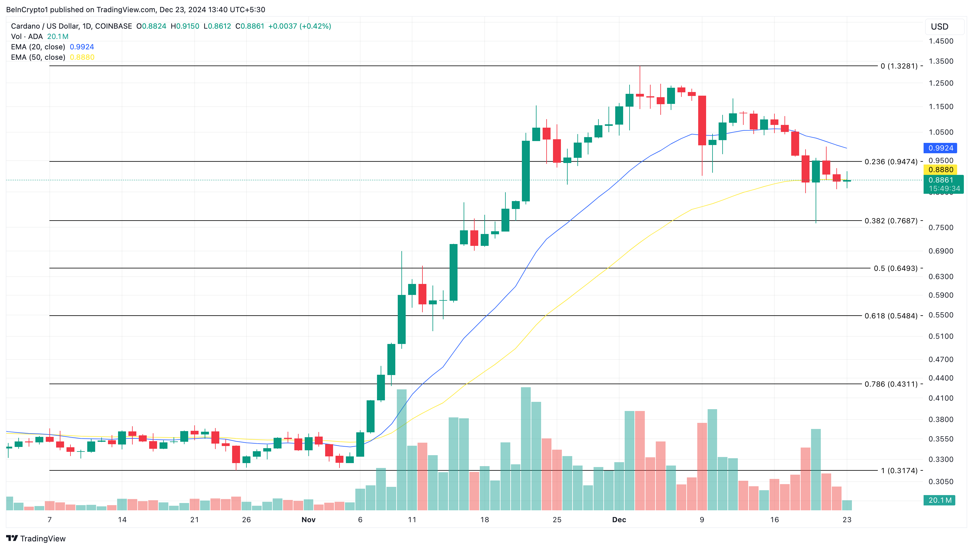 จากมุมมองทางเทคนิค ค่าเฉลี่ยเคลื่อนที่แบบเอ็กซ์โพเนนเชียล (EMA) ชี้ให้เห็นว่าราคาของ Cardano อาจลดลงต่อไป EMA เป็นตัวบ่งชี้ที่วัดแนวโน้มรอบสกุลเงินดิจิทัล