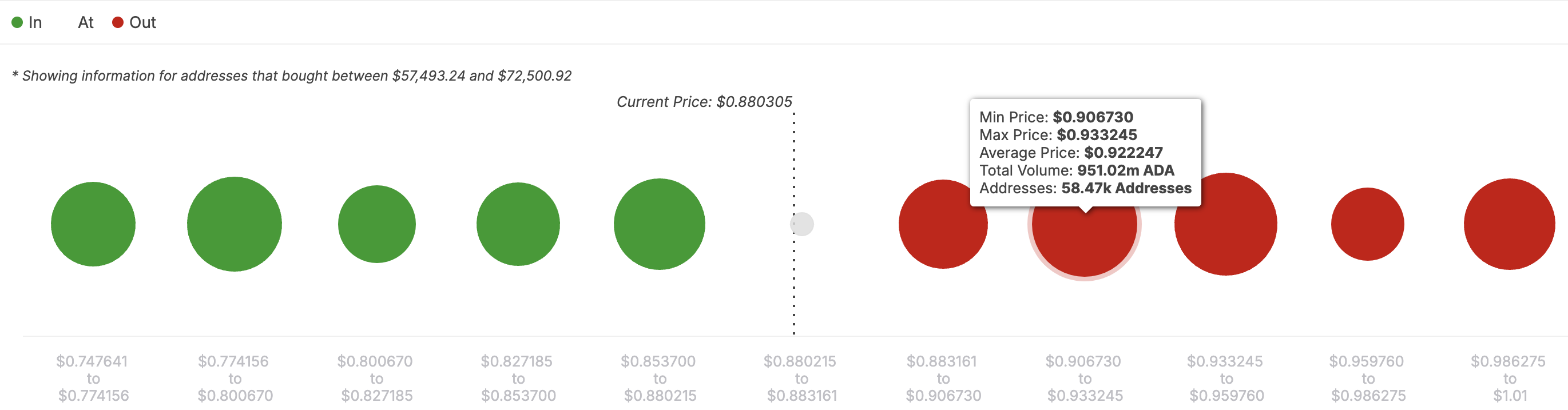 ตามข้อมูลจาก IntoTheBlock ความต้านทานหลักสำหรับ ADA อยู่ที่ประมาณ 0.92 USD ในพื้นที่นี้ มีที่อยู่ Cardano จำนวน 58,470 ที่สะสมโทเค็น 951.02 ล้านโทเค็น ซึ่งสูงกว่าโทเค็นในเงินระหว่าง 0.74 ถึง 0.88 USD