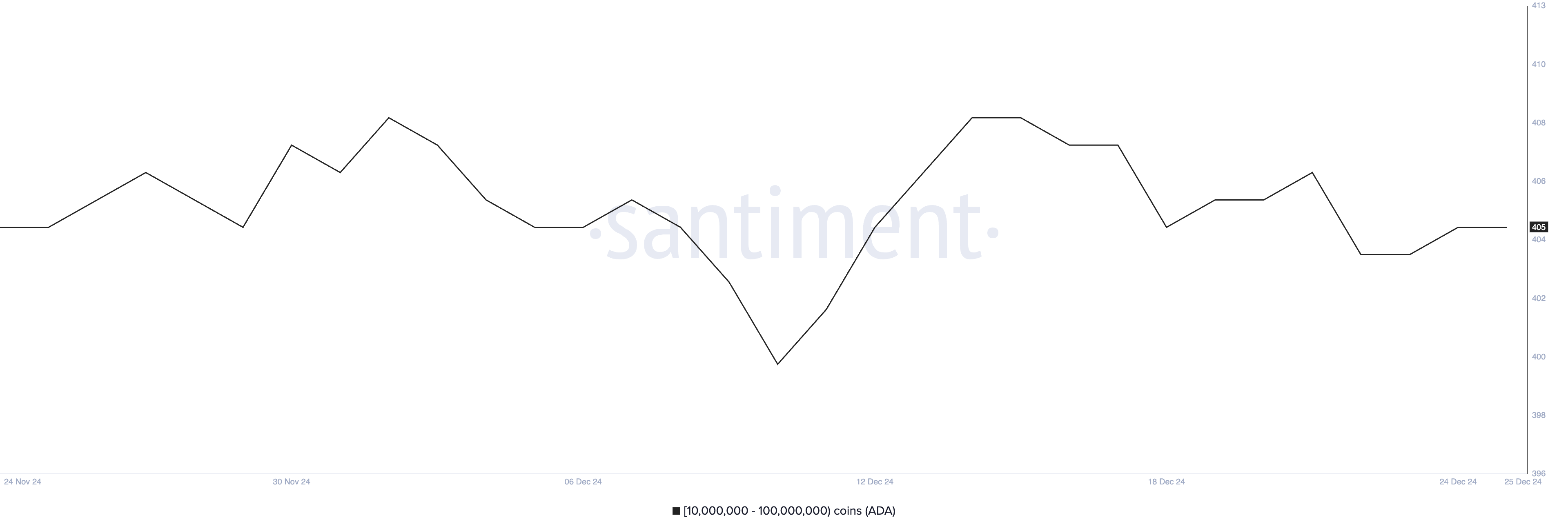จำนวนวาฬ ADA ซึ่งกำหนดเป็นที่อยู่ที่ถือครองระหว่าง 10 ล้านถึง 100 ล้าน ADA ถึงจุดสูงสุดรายเดือนที่ 409 เมื่อวันที่ 14 ธันวาคม ก่อนที่จะเริ่มลดลง