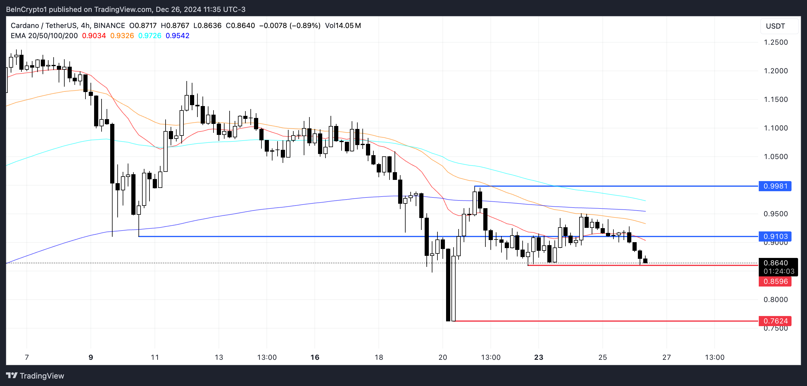ในทางกลับกัน หากแนวโน้มขาลงกลับมาแข็งแกร่งและแนวรับที่ 0.859 ดอลลาร์ ไม่สามารถยืนหยัดได้ ราคาของ Cardano อาจเผชิญกับแรงกดดันขาลงเพิ่มเติม