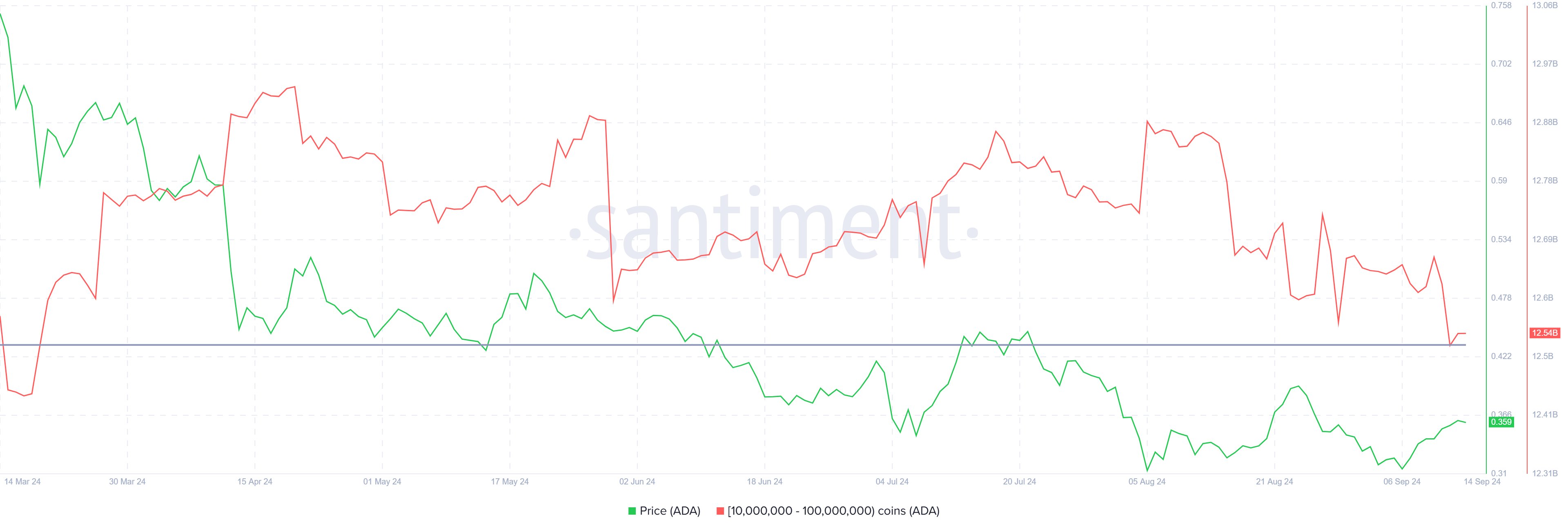 นักลงทุนรายใหญ่ของ Cardano แสดงความไม่มั่นใจเพิ่มขึ้นต่อการเคลื่อนไหวราคาในระยะสั้นของ ADA ในช่วงไม่กี่วันที่ผ่านมา ที่อยู่ที่ถือหุ้นระหว่าง 10 ล้านถึง 100 ล้าน ADA ได้ขายทิ้งประมาณ 140 ล้านเหรียญ มูลค่ามากกว่า 50 ล้าน USD สะท้อนให้เห็นถึงการเข้าหาสกุลเงินดิจิทัลอย่างระมัดระวัง