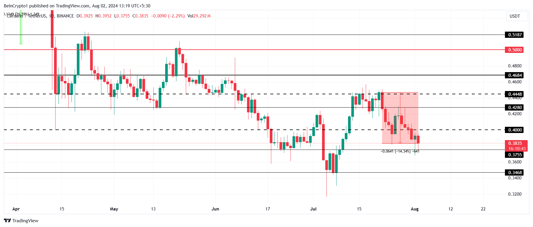ราคาของ Cardano ลดลงมากกว่า 14% ในช่วง 11 วันที่ผ่านมา และปัจจุบันซื้อขายที่ 0.38 ดอลลาร์ แนวรับที่สําคัญถัดไปสําหรับ ADA อยู่ที่ 0.37 ดอลลาร์ ซึ่งได้รับการทดสอบแล้วในอดีต