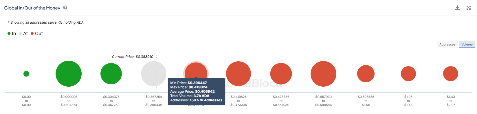 จากตัวบ่งชี้ Global In/Out of the Money (GIOM) เมื่อต้นสัปดาห์นี้ 3.7 พันล้าน ADA มูลค่าประมาณ 1.4 พันล้านดอลลาร์กลายเป็นแบกรับการขาดทุน อุปทานนี้ถูกซื้อระหว่าง 0.39 ถึง 0.41 ดอลลาร์ ซึ่ง ADA ลดลงหลังจากสูญเสียแนวรับที่ 0.40 ดอลลาร์