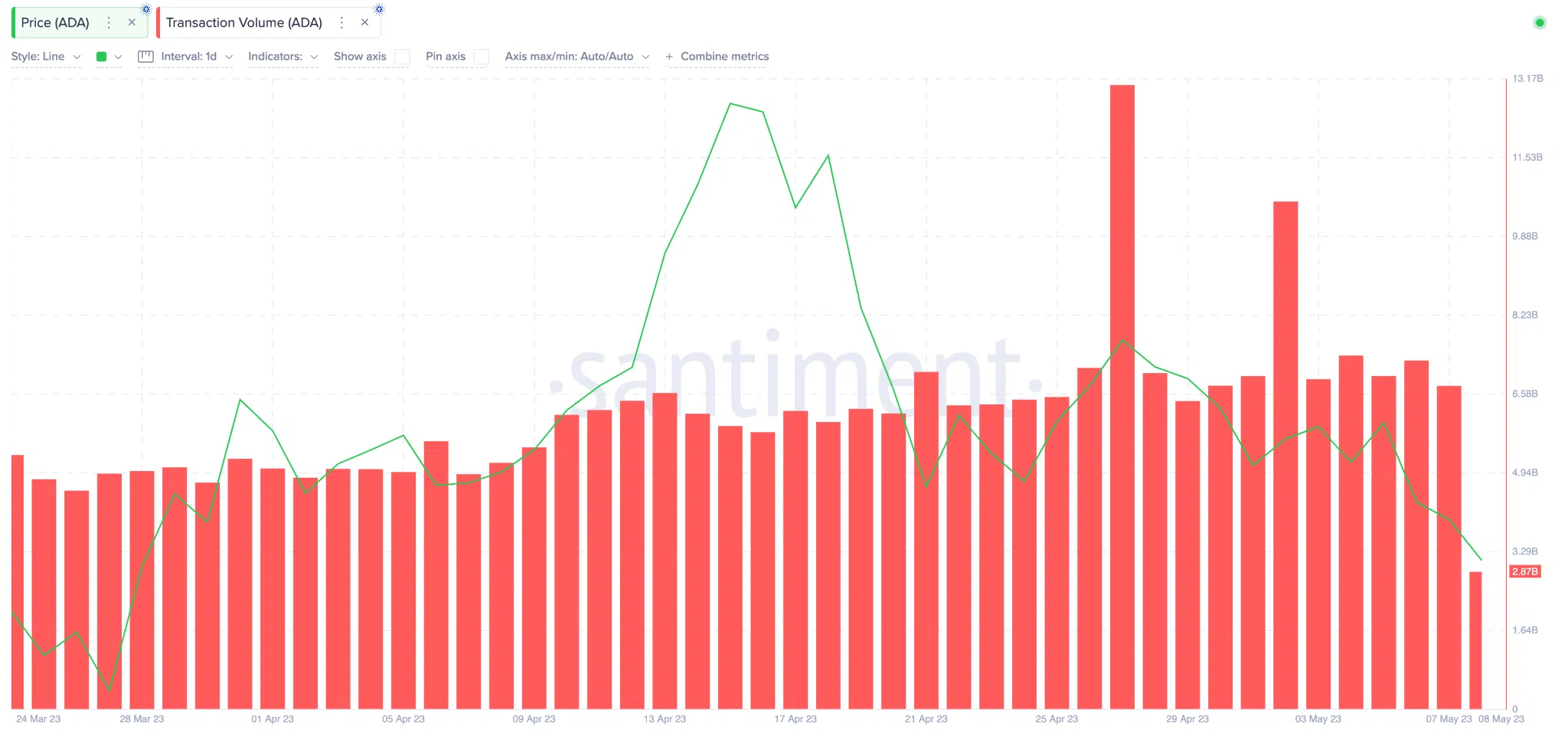 ในระหว่างวันที่ 16 เมษายนถึง 7 พฤษภาคม 2023 ปริมาณธุรกรรมรายวันบนเครือข่าย Cardano เพิ่มขึ้นจาก 5.79 พันล้านดอลลาร์เป็น 6.76 พันล้านดอลลาร์สหรัฐฯ