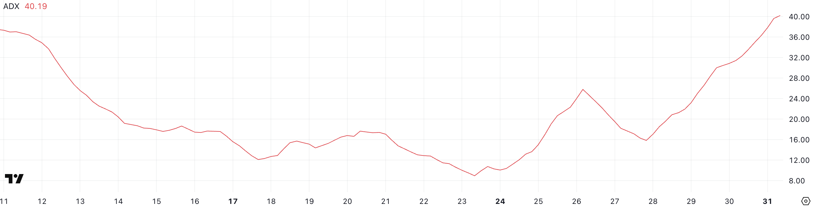 ดัชนีทิศทางเฉลี่ย (ADX) ของ Cardano ปัจจุบันอยู่ที่ 40.19 เพิ่มขึ้นอย่างรวดเร็วจาก 15.83 เพียงสี่วันที่ผ่านมา การเพิ่มขึ้นอย่างรวดเร็วนี้บ่งชี้ถึงการเสริมสร้างโมเมนตัมของแนวโน้มอย่างรวดเร็ว