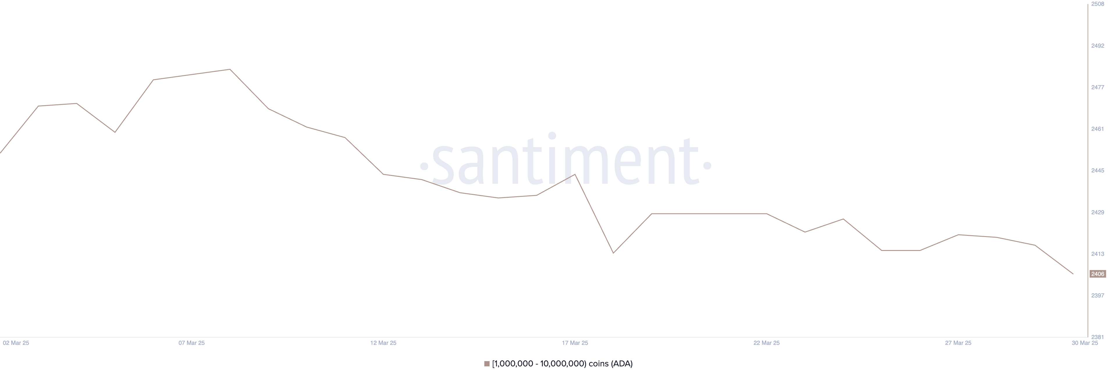 จำนวน วาฬ Cardano—กระเป๋าเงินที่ถือ ADA ระหว่าง 1 ล้านถึง 10 ล้าน—ลดลงเหลือ 2,406 จาก 2,421 เพียงสี่วันที่ผ่านมา