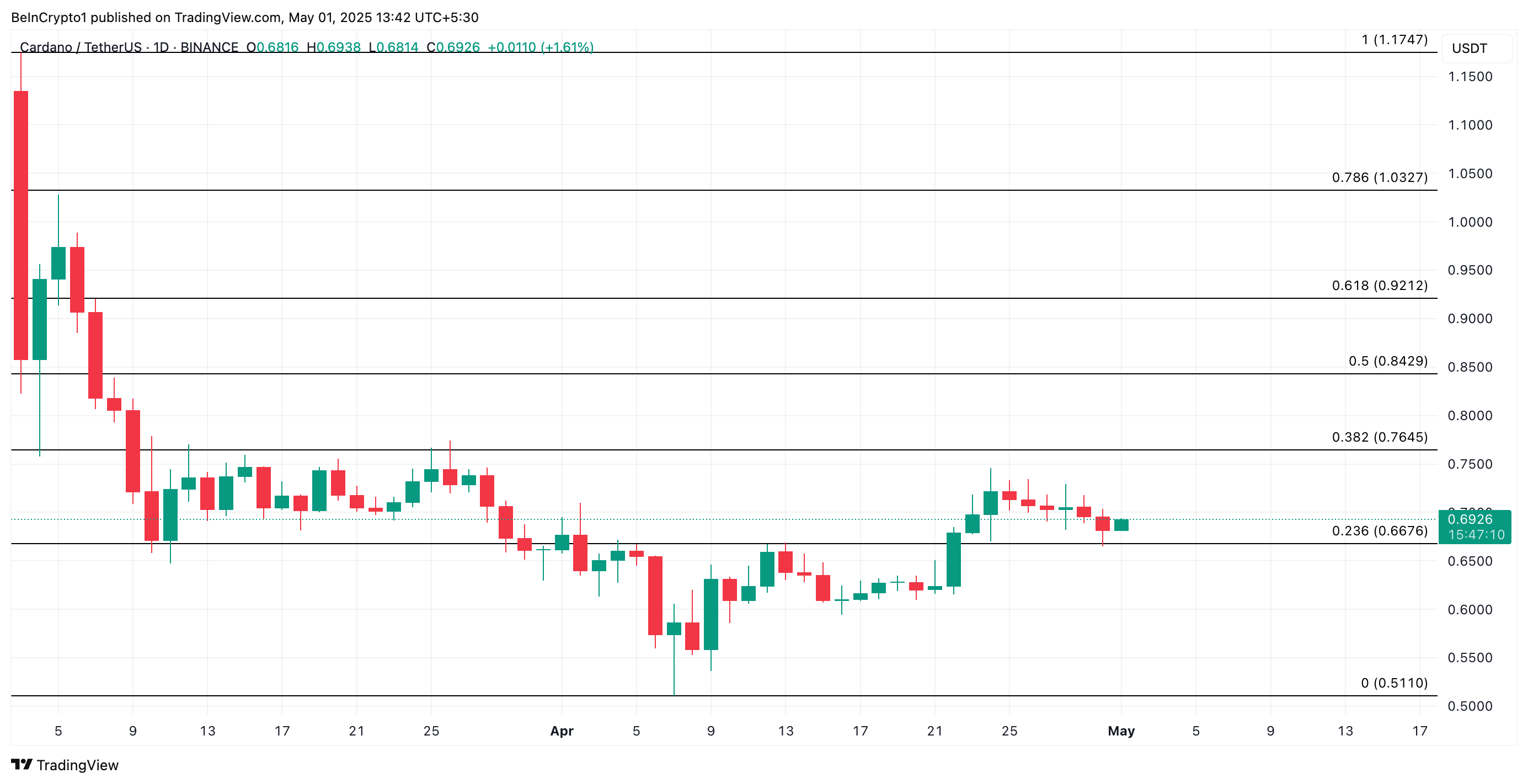 ADA ปัจจุบันซื้อขายที่ USD0.69 โดยอยู่เหนือแนวรับที่ USD0.66 หากแรงกดดันจากฝั่งซื้ออ่อนลงอีก ADA อาจหลุดแนวรับนี้และตกลงไปสู่ระดับต่ำสุดของปีที่ USD0.51