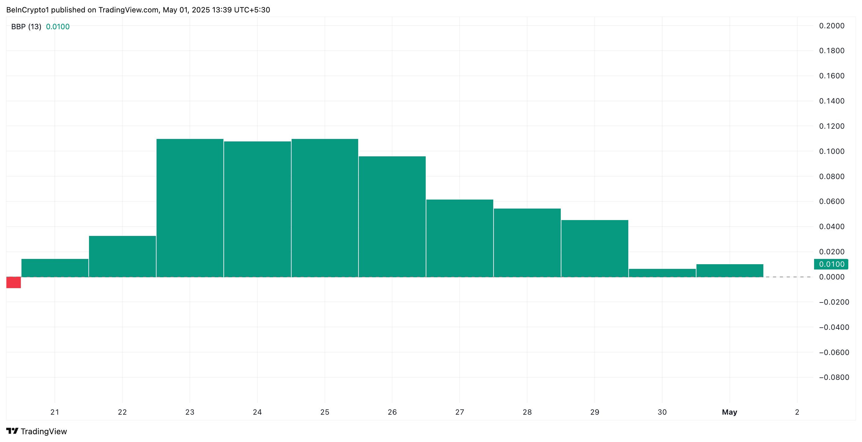 Sponsoredการลดลงอย่างค่อยเป็นค่อยไปของขนาดแท่งดัชนี Elder-Ray มักบ่งบอกถึงช่องว่างที่ลดลงระหว่างแรงกระทิงและแรงหมี เมื่อแรงกระทิงอ่อนแอลงและฝ่ายหมีเริ่มควบคุม แท่งฮิสโตแกรมจะหดตัว ซึ่ง มักจะเป็น สัญญาณเตือนล่วงหน้าของการกลับตัวของแนวโน้มหรือความเป็นไปได้ที่เพิ่มขึ้นของการเคลื่อนไหวของราคาลง