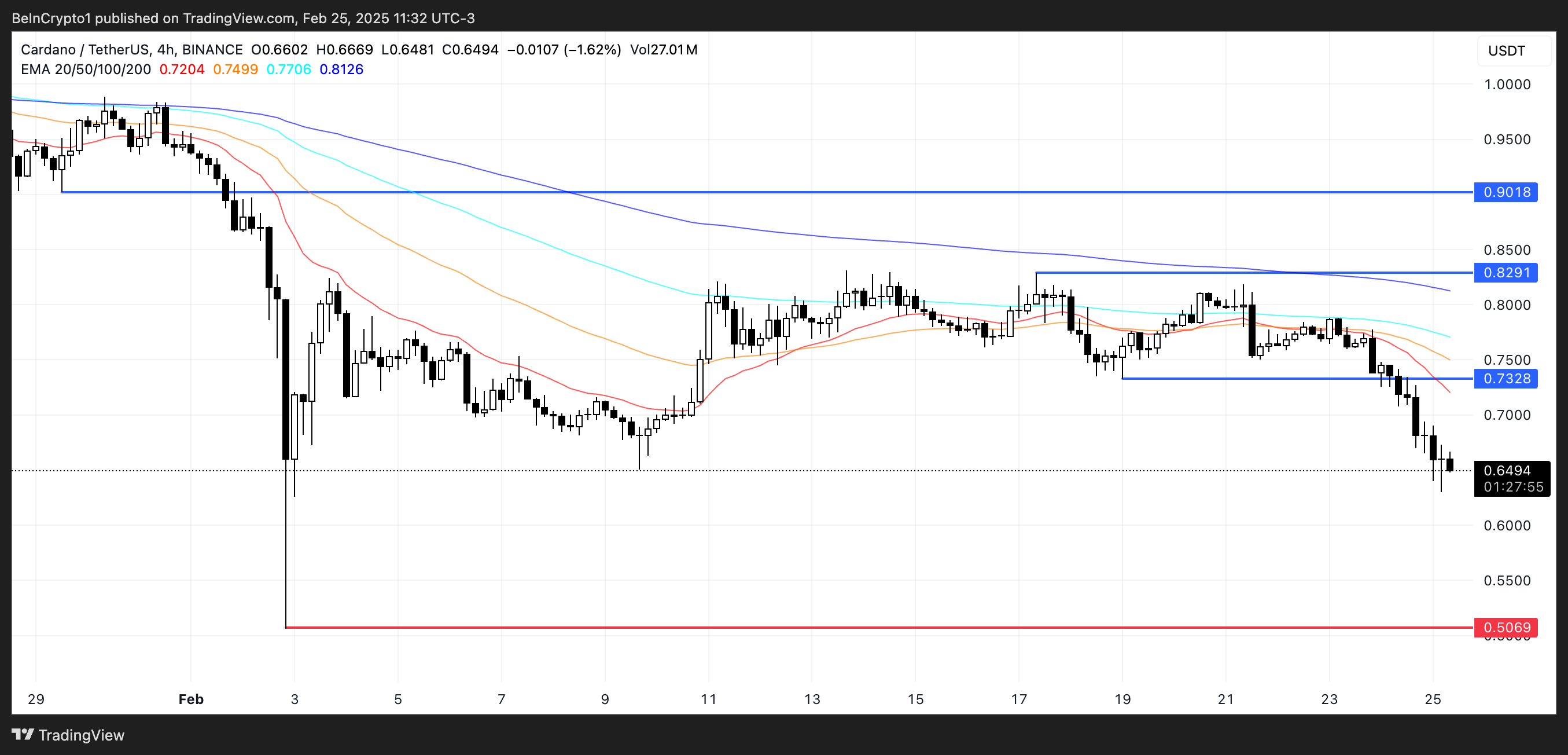ราคาของ Cardano ลดลง 18% ในสองวันที่ผ่านมา โดยเส้น EMA ของมันสร้างรูปแบบขาลงที่แข็งแกร่ง เส้น EMA ระยะสั้นอยู่ต่ำกว่าเส้นระยะยาวอย่างชัดเจน บ่งบอกถึงแรงขายที่รุนแรงและยืนยันโมเมนตัมขาลง