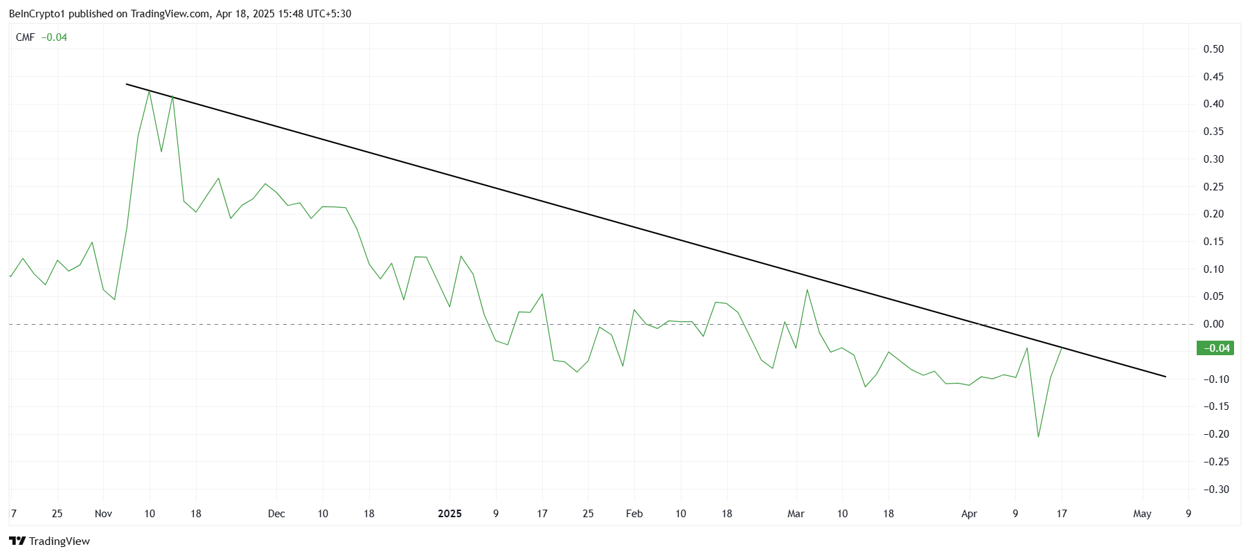 ปัจจุบันติดอยู่ต่ำกว่าศูนย์ บ่งชี้ว่าการไหลออกมีมากกว่าการไหลเข้า สะท้อนถึงความไม่มั่นใจของนักลงทุน CMF สะท้อนถึงพฤติกรรมที่ระมัดระวังจากนักลงทุน เนื่องจากพวกเขามีแนวโน้มที่จะไม่เข้าสู่ตลาดในสภาวะขาลงที่กำลังเกิดขึ้น การขาดความมั่นใจในตลาดกำลังดึงนักลงทุน ออกจาก Cardano
