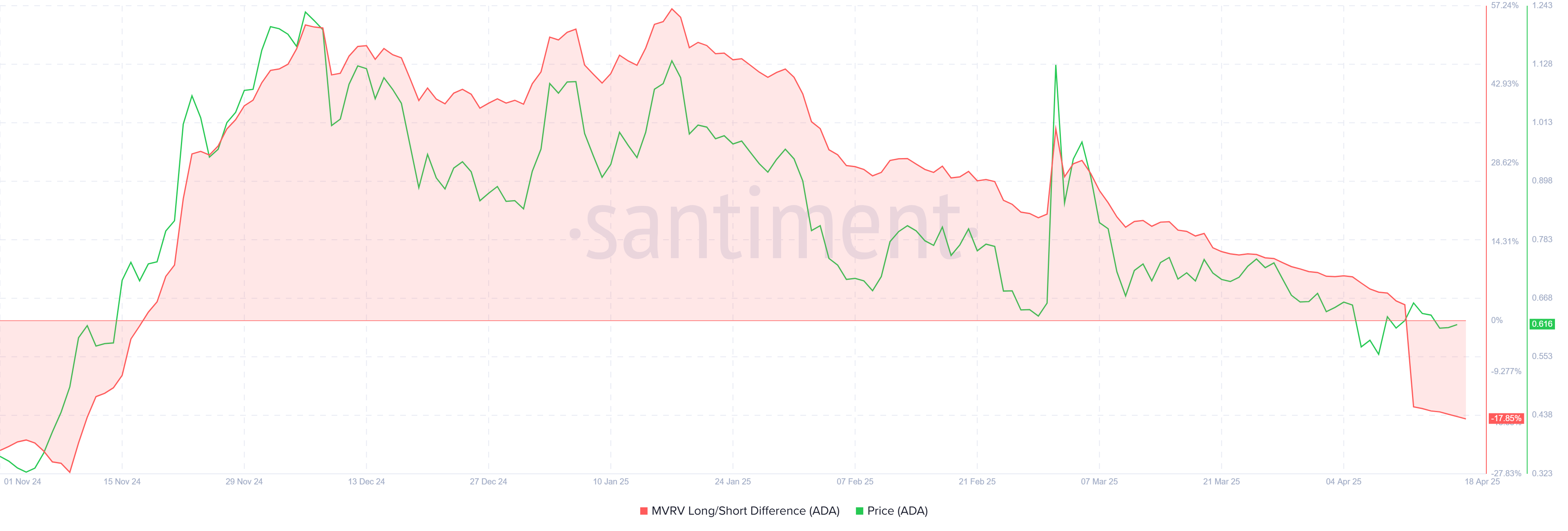ความแตกต่างระหว่างมูลค่าตลาดกับมูลค่าที่รับรู้ (MVRV) ระยะยาว/ระยะสั้นของ Cardano ลดลงเหลือ -18% ซึ่งเป็นระดับต่ำสุดในรอบห้าเดือน นี่บ่งชี้ว่า STHs อยู่ในตำแหน่งที่จะรับรู้กำไรอย่างมาก ซึ่งสูงที่สุดตั้งแต่พฤศจิกายน 2024