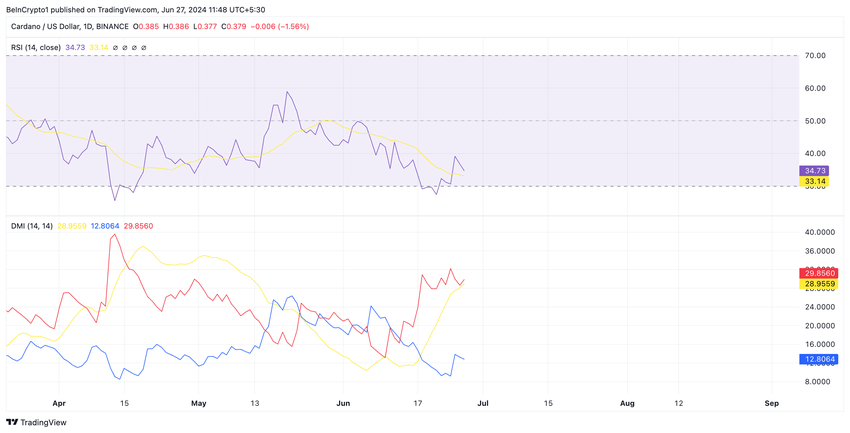 ที่ 34.12 RSI ของ ADA ชี้ให้เห็นว่าแรงขายของเหรียญมีมากกว่ากิจกรรมการซื้อ