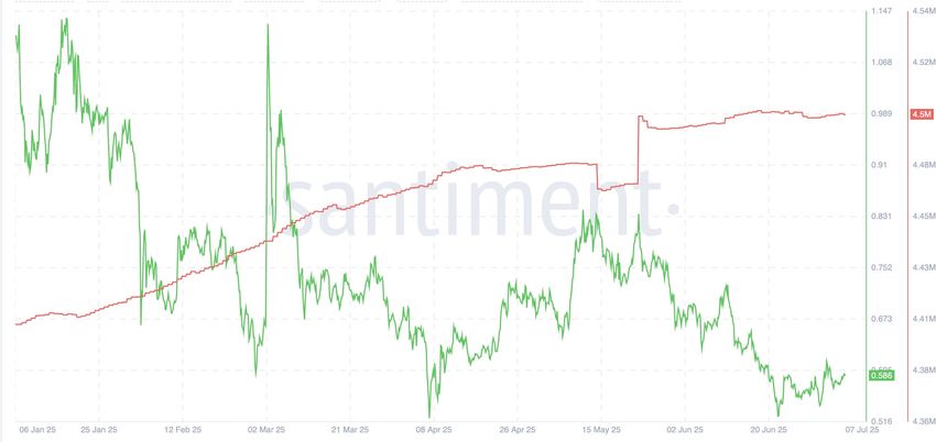หนึ่งในสัญญาณที่ชัดเจนที่สุดของความเชื่อมั่นคือการเพิ่มขึ้นอย่างต่อเนื่องของผู้ถือ ADA ทั้งหมด จากข้อมูลหกเดือน จำนวนวอลเล็ตที่ถือ ADA เพิ่งแตะระดับสูงสุดใหม่ของปีที่ 4.5 ล้าน นี่เกิดขึ้นแม้ว่าราคาจะลดลงจาก USD 0.90 เป็น USD 0.58