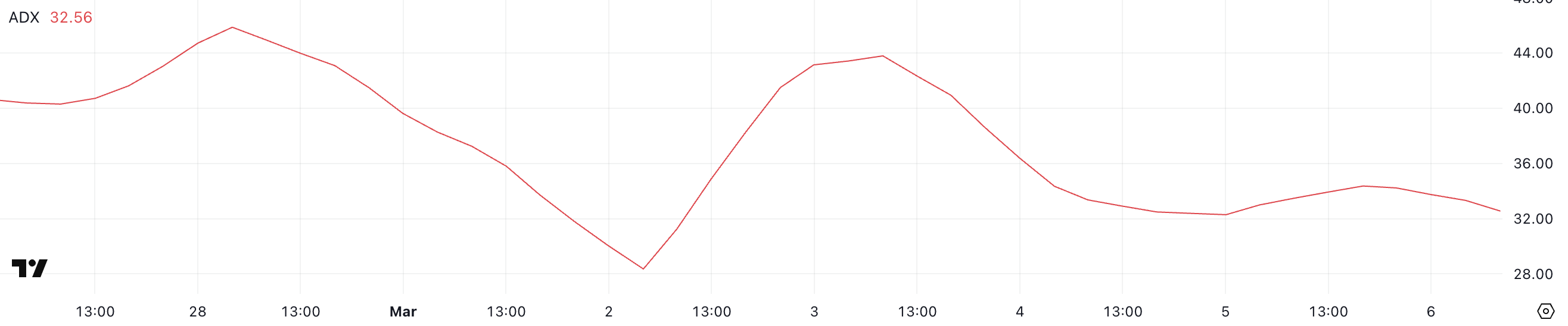 Cardano มี ADX ที่ 32.5 ลดลงจาก 43.7 เมื่อสามวันที่แล้ว หลังจากการพุ่งขึ้นของราคาที่เกิดจาก การรวม ADA ในทุนสำรองคริปโตของสหรัฐฯ
