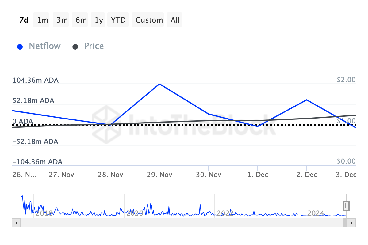 ณ ขณะนี้ การไหลสุทธิลดลงเหลือ 7.62 ล้าน ADA ตามข้อมูลจาก IntoTheBlock ซึ่งบ่งชี้ว่า วาฬได้ขาย 55.96 ล้าน ADA — อาจเพื่อทำกำไรหรือปรับสมดุลพอร์ตการลงทุน ที่ราคาปัจจุบันของ Cardano การขายนี้มีมูลค่าถึง 69 ล้าน USD
