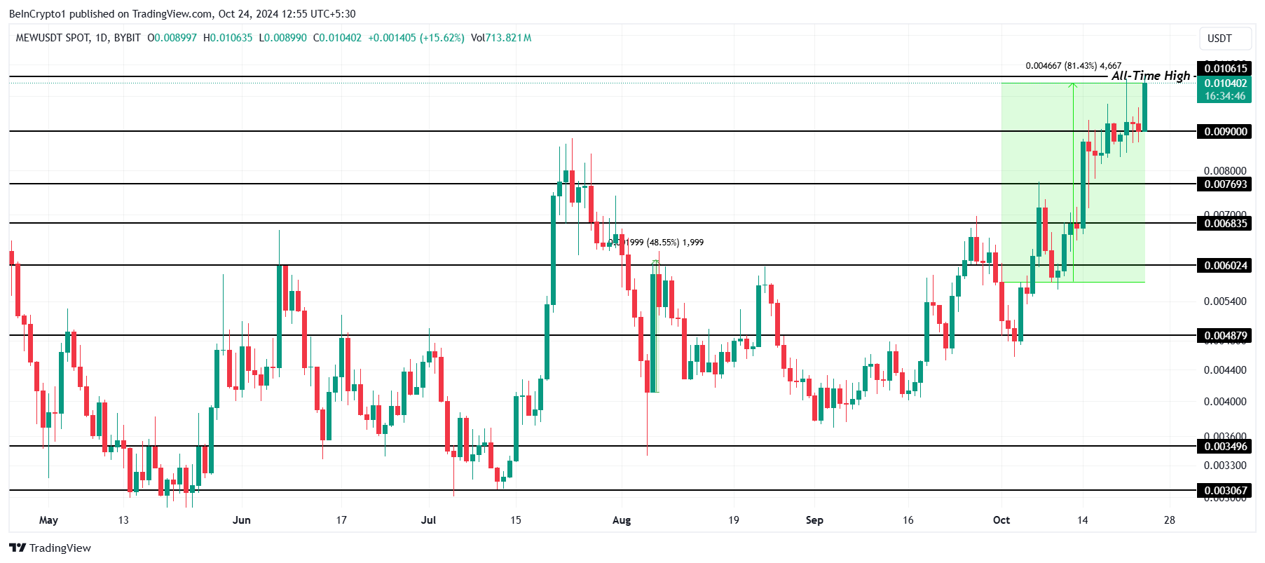 MEW ได้ทำสถิติสูงสุดใหม่ที่ USD 0.0106 ซึ่งเป็นครั้งที่สี่ใน 14 วันที่ผ่านมา memecoin ที่มีธีมแมวนี้ยังคงแนวโน้มขาขึ้น สร้างความสนใจจากนักลงทุนอย่างมาก ช่วงเวลาที่ราคาเพิ่มขึ้นนี้ได้เน้นย้ำถึงแรงผลักดันที่เพิ่มขึ้นของ MEW ทำให้เป็นหนึ่งในผู้ทำผลงานดีที่สุดในตลาด memecoin