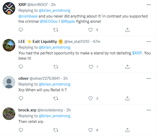 แฟนๆ Ripple (XRP) เป็นหนึ่งในบรรดาผู้ที่ตอบโต้ความคิดเห็นล่าสุดของ Armstrong โดยต้องการทราบว่าเมื่อใดที่สินทรัพย์โปรดของพวกเขาจะเปิดให้บริการในกระดานเทรด การซื้อขาย XRP ถูกระงับบน Coinbase ตั้งแต่มกราคม 2021 เนื่องจากการสอบสวนอย่างต่อเนื่องของสำนักงาน ก.ล.ต.