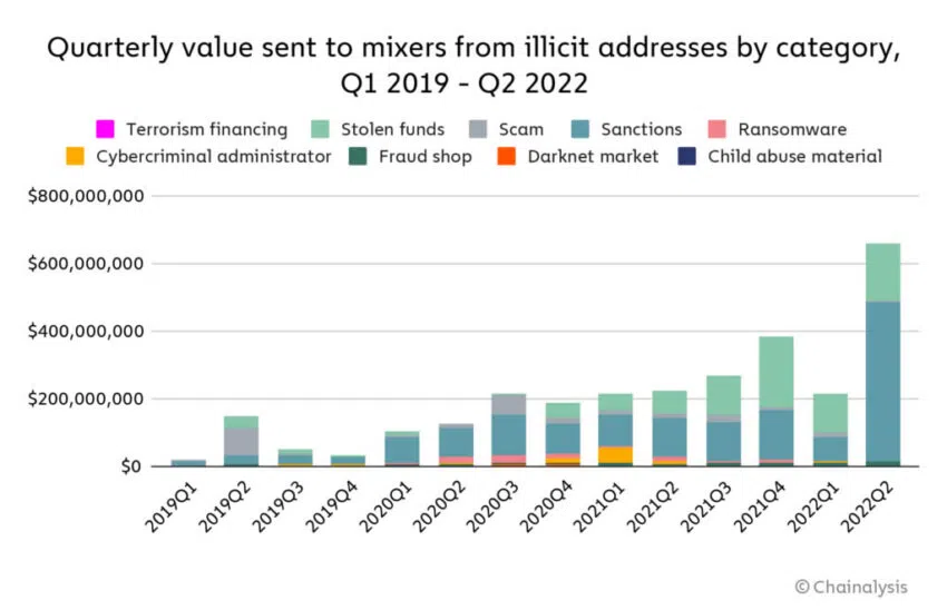 Chainanalysis ยังกล่าวเสริมว่าค่าเฉลี่ยเคลื่อนที่ 30 วันของสินทรัพย์คริปโตที่ส่งไปยังมิกเซอร์ทําสถิติสูงสุดตลอดกาลที่ 51.8 ล้านดอลลาร์สหรัฐในเดือนเมษายน จํานวนเงินที่ส่งไปมิกเซอร์ในไตรมาสที่ 2 ปี 2022 มีมูลค่าสูงถึง 600 ล้านดอลลาร์สหรัฐ แต่ส่วนใหญ่มาจากหน่วยงานที่ถูกคว่ำบาตรและเป็นเงินที่ถูกขโมย