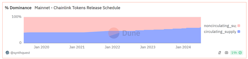 นักวิเคราะห์อธิบายสาเหตุนี้ว่าเป็นเพราะปริมาณเหรียญ LINK ที่หมุนเวียนเพิ่มขึ้น ในเดือนพฤษภาคม 2021 มีเหรียญหมุนเวียนอยู่ 425 ล้านเหรียญ ซึ่งเพิ่มขึ้นเป็น 608 ล้านเหรียญ ณ วันที่ 29 มิถุนายน 2024