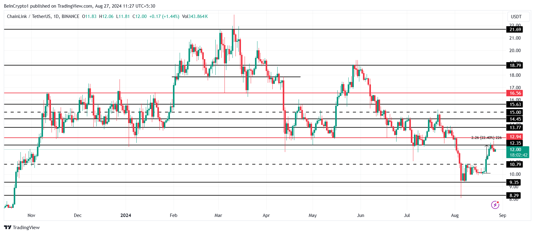 ราคาของ Chainlink ที่ $12.00 กําลังมองหาที่จะพลิกแนวต้านที่ $12.35 เป็นระดับแนวรับ ระดับนี้ได้รับการทดสอบหลายครั้งในฐานะจุดตีกลับ ทําให้การฟื้นตัวเหนือระดับนั้นมีความสําคัญต่อ LINK