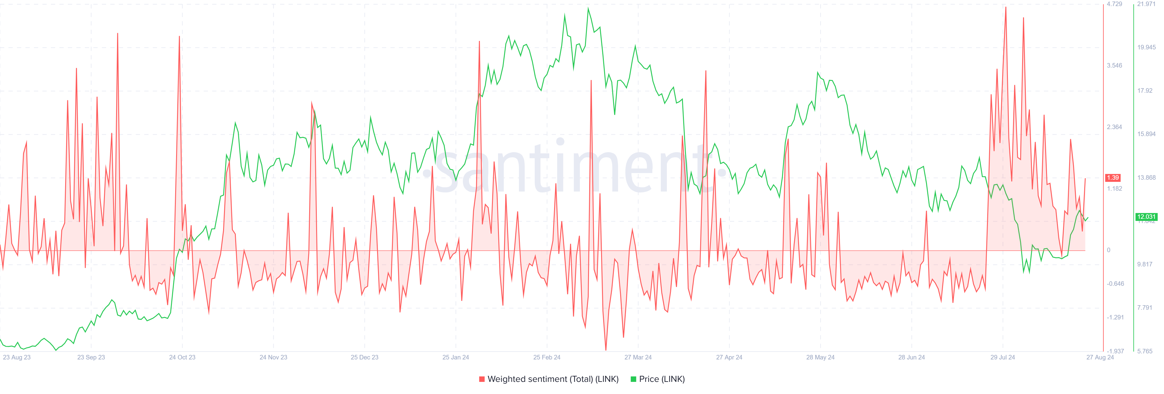 แม้ราคาจะเพิ่มขึ้นเมื่อเร็ว ๆ นี้ แต่ความเชื่อมั่นถ่วงน้ําหนักสําหรับ LINK ก็ลดลงอย่างต่อเนื่อง ปัจจุบันยังคงอยู่เหนือเส้นศูนย์ ซึ่งบ่งชี้ว่ายังคงมีความรู้สึกเชิงบวกในหมู่ผู้ถือ อย่างไรก็ตาม การมองโลกในแง่ดีนี้ค่อยๆ จางหายไป