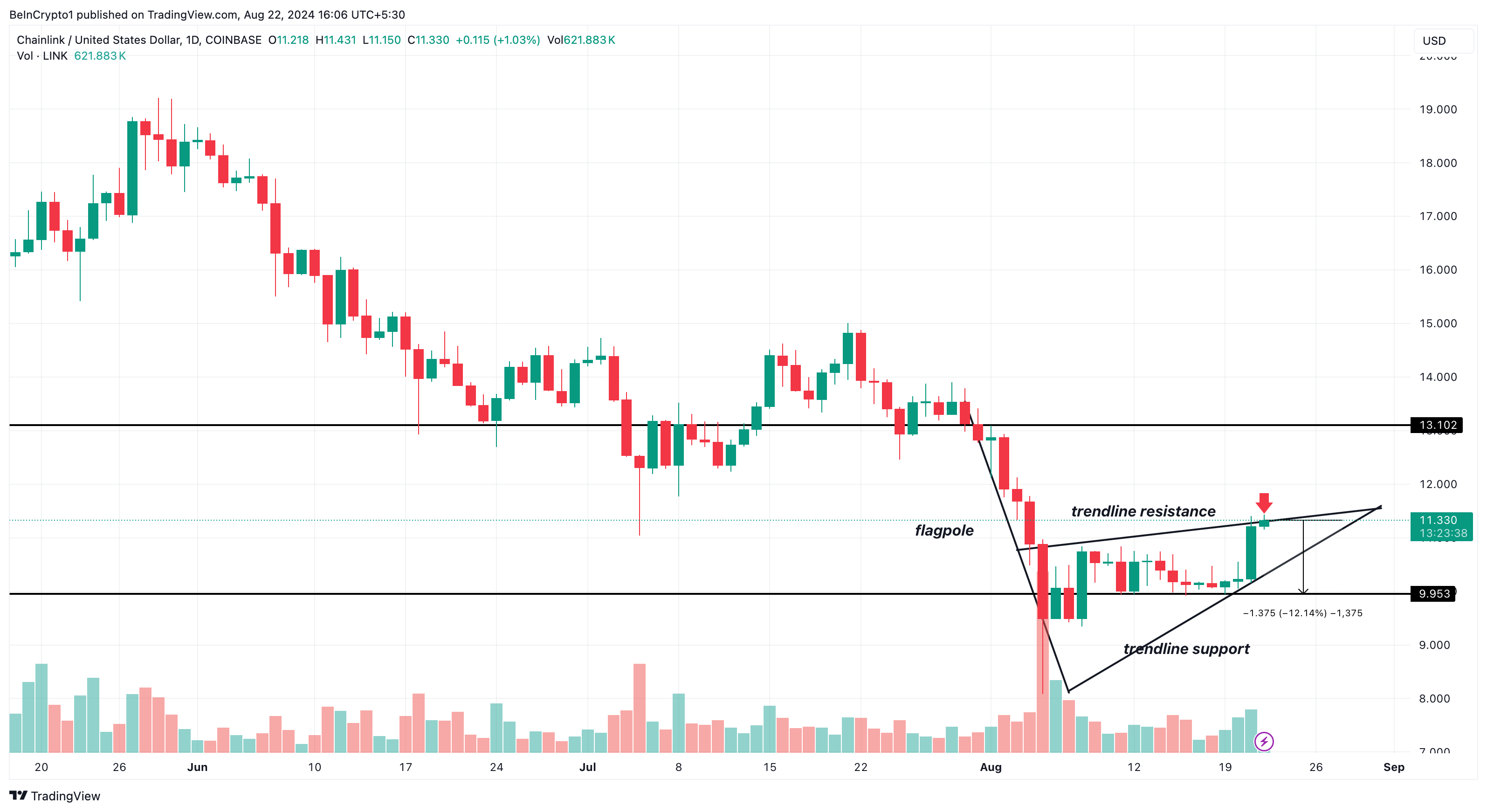 ในกราฟรายวัน LINK ได้สร้างธงขาลง ซึ่งอาจส่งสัญญาณหยุดชั่วคราวในแนวโน้มขาขึ้นในปัจจุบัน ธงขาลงมักจะปรากฏขึ้นเมื่อเส้นแนวโน้มสามเส้นมาบรรจบกัน: เสาธง (เป็นผลมาจากแนวโน้มขาลงเริ่มต้น) และเส้นสองเส้นที่แสดงถึงแนวต้านระหว่างการรวมบัญชีและแนวรับที่ค่าที่ต่ํากว่า