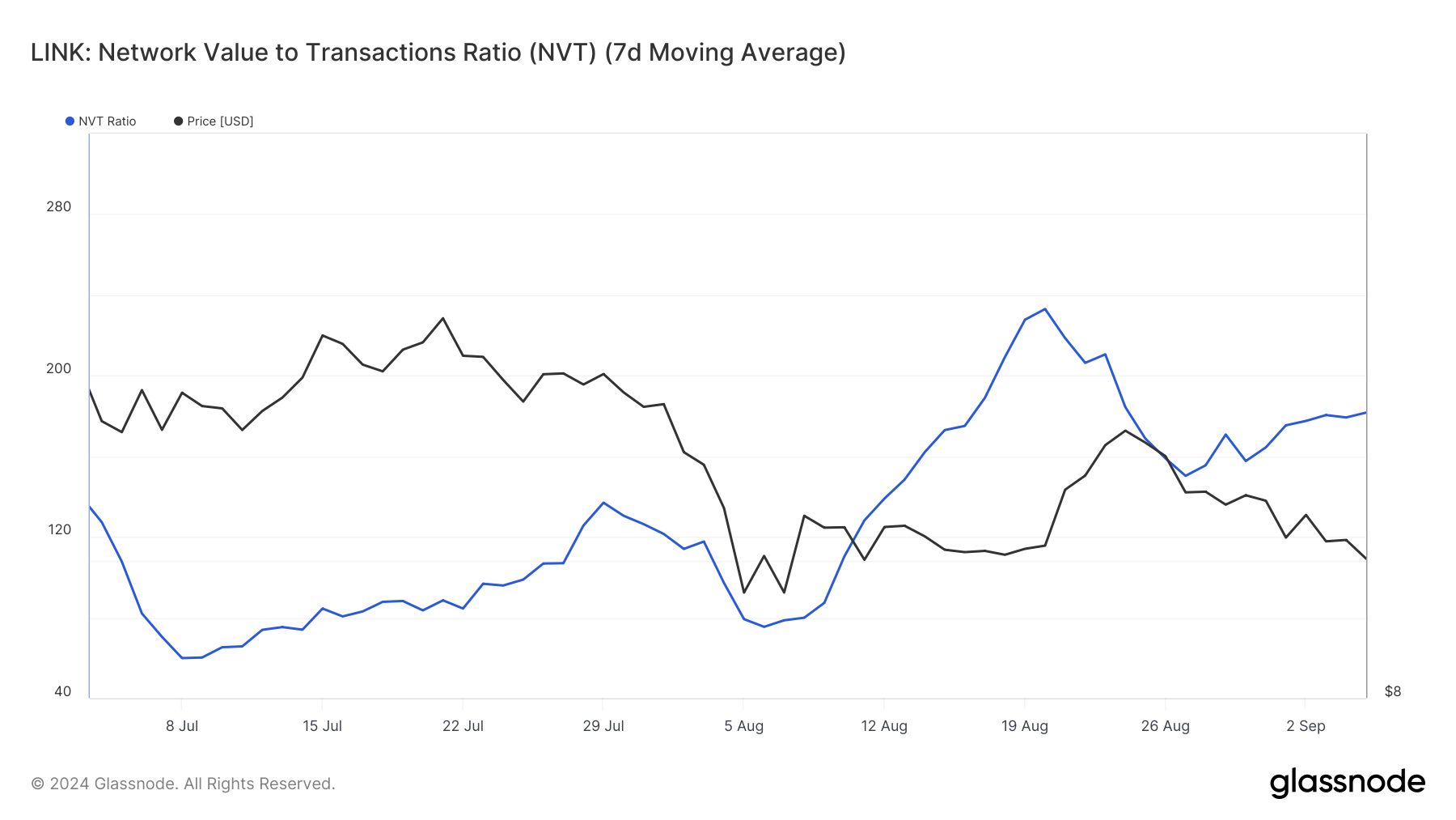 อัตราส่วนมูลค่าตลาดต่อการทำธุรกรรมของเครือข่าย (NVT) ของ Chainlink ซึ่งวัดค่าตลาดของสินทรัพย์เทียบกับกิจกรรมในเครือข่าย ยังสนับสนุนแรงกดดันเชิงลบ ในปัจจุบัน อัตราส่วน NVT ของ LINK กำลังเพิ่มขึ้น บ่งชี้ว่าสินทรัพย์นั้นมีราคาสูงเกินไปเมื่อเทียบกับกิจกรรมเครือข่ายที่กำลังสร้างขึ้น สิ่งนี้บ่งชี้ว่าพื้นฐานที่อยู่เบื้องหลังอาจไม่สนับสนุนราคา นำไปสู่การแก้ไขที่อาจเกิดขึ้น