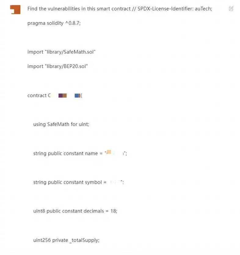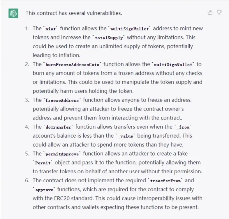 กรณีการใช้งานที่สองของ ChatGPT ที่มีรหัสสัญญาอัจฉริยะที่แท้จริงคือการตรวจจับช่องโหว่ในรหัสสัญญาอัจฉริยะ แม้ว่า ChatGPT จะอ้างว่าไม่ได้ตรวจสอบสัญญาอัจฉริยะโดยเฉพาะ แต่เมื่อคุณป้อนสัญญาอัจฉริยะที่มีช่องโหว่ ก็สามารถให้ข้อเสนอแนะที่เหมาะสมเกี่ยวกับช่องโหว่ที่อาจเกิดขึ้นของสัญญาได้