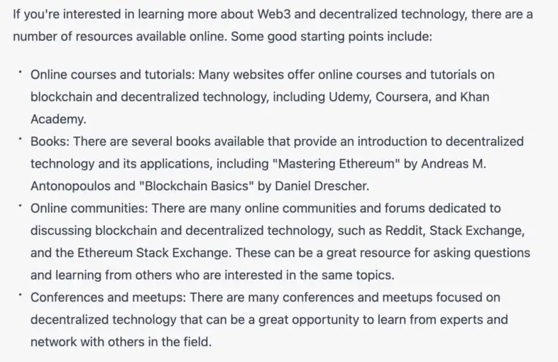 แน่นอนว่าการศึกษานอกเหนือไปจากสำหรับผู้เริ่มต้นเท่านั้น เป็นเครื่องมือที่มีประโยชน์สำหรับทุกคนที่ต้องการเข้าใจมุมใหม่ของ Web3 ไม่ว่าจะเป็น zk-SNARK หรือโปรโตคอลการสื่อสารระหว่างบล็อกเชน เนื่องจาก Web3 เป็นทั้งอุตสาหกรรมที่มีความหลากหลายและมีความท้าทายทางเทคนิค จึงมีแง่มุม แนวคิด และแนวคิดใหม่ ๆ ให้คุณคาดคิดอยู่เสมอ และนั่นเป็นเหตุผลว่าทำไมเครื่องมือทางการศึกษาที่ซับซ้อน เช่น ChatGPT จึงมีความจำเป็นอย่างมากใน Web3